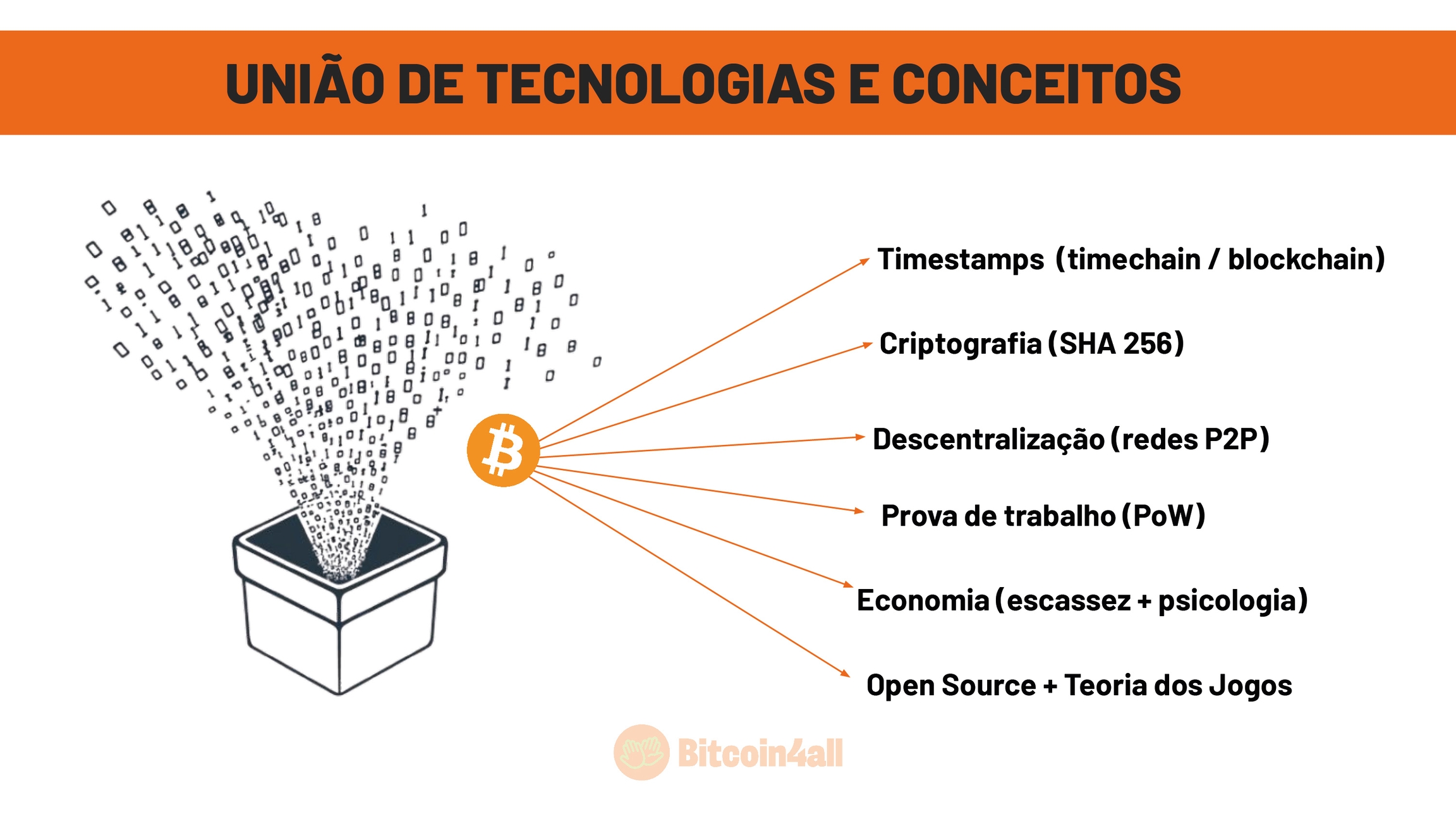 Bitcoin é o resultado da combinação de várias tecnologias. Separadamente, essas tecnologias não teriam as mesmas características e propriedades que tornam o Bitcoin único. É essa união que possibilitou a criação de algo tão revolucionário.