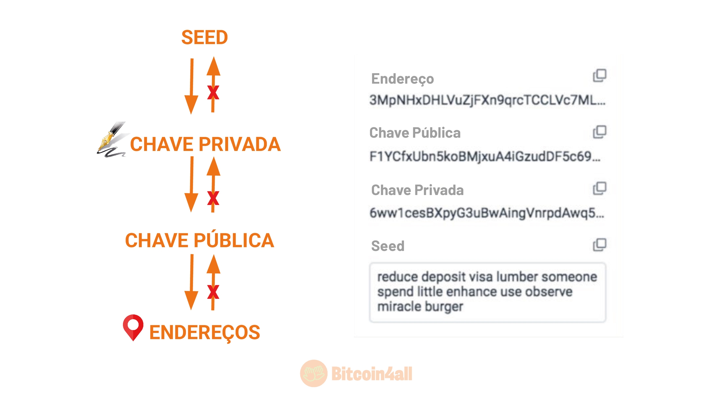 Quando você configura a sua carteira bitcoin ela gera uma lista de palavras chamada "seed phrase". Essas palavras representam códigos que permitem que você receba, armazene e envie bitcoin. A partir das seeds, a sua carteira vai gerar outros códigos criptografados chamados chaves públicas e privadas.