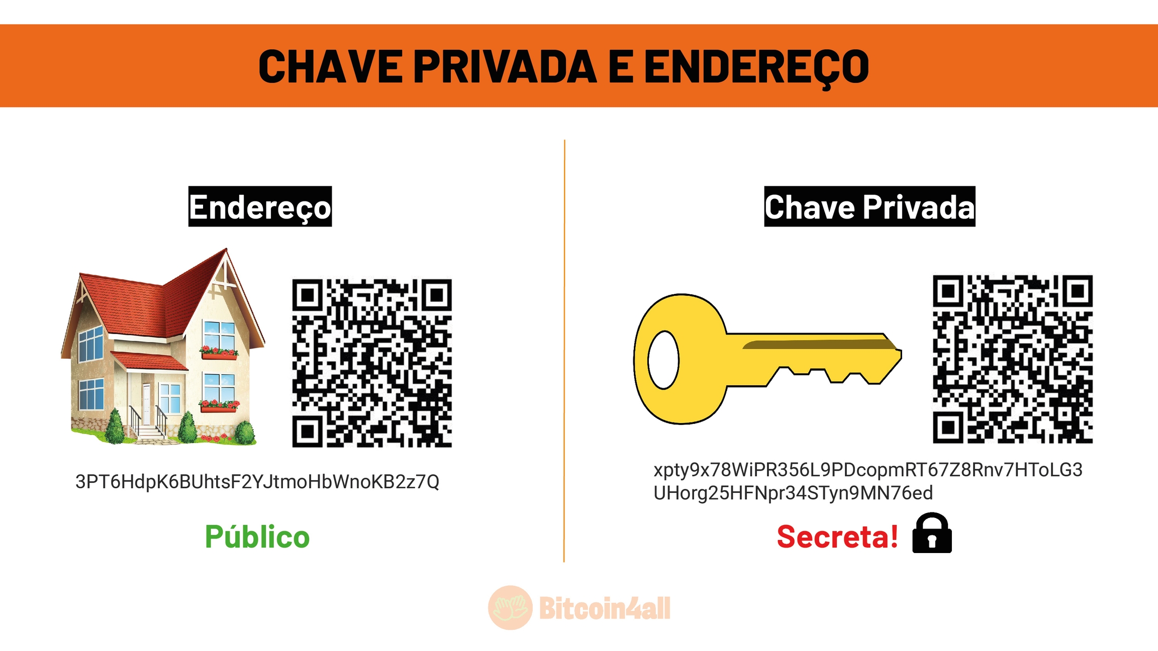 Então o endereço é como se fosse o endereço da sua casa e as chaves privadas é o que dá acesso ao que tem dentro dela: seu saldo em bitcoin.
