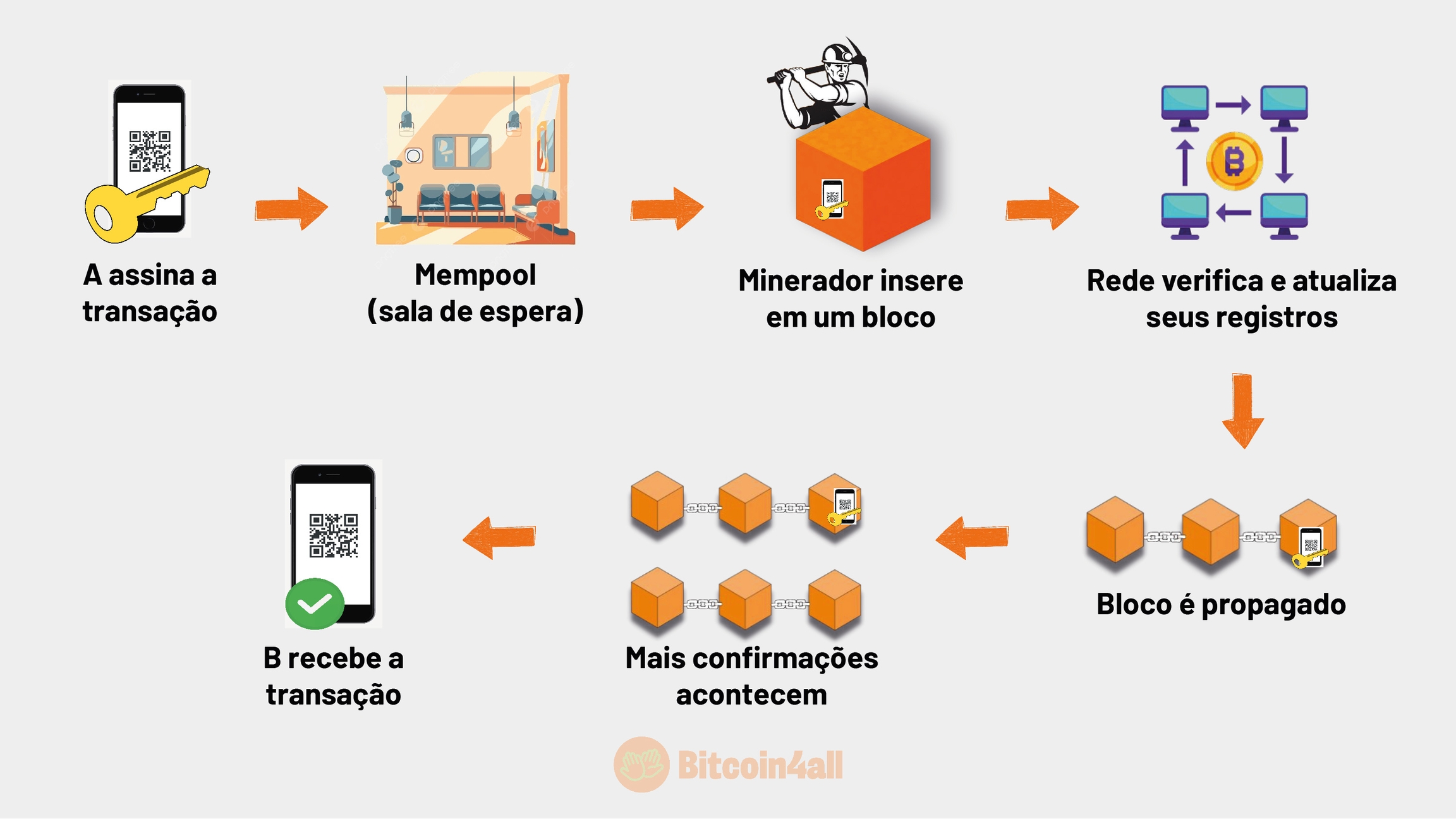 Quando você assina a transação provando pra rede bitcoin que é o verdadeiro dono da chave privada do endereço da carteira, essa transação vai para uma sala de espera, conhecida como mempool. Essa é a sala de espera das transações que ficam aguardando até serem inseridas em um bloco pelos mineradores. As transações são registradas em blockchain quando um minerador seleciona as transações para fazerem parte do bloco de informação. Assim que um minerador inserir a transação em um bloco, esse bloco é verificado pela rede e ela atualiza os seus registros da blockchain. Aí então esse bloco é propagado por toda a rede como um bloco válido, com a transação dentro dele.