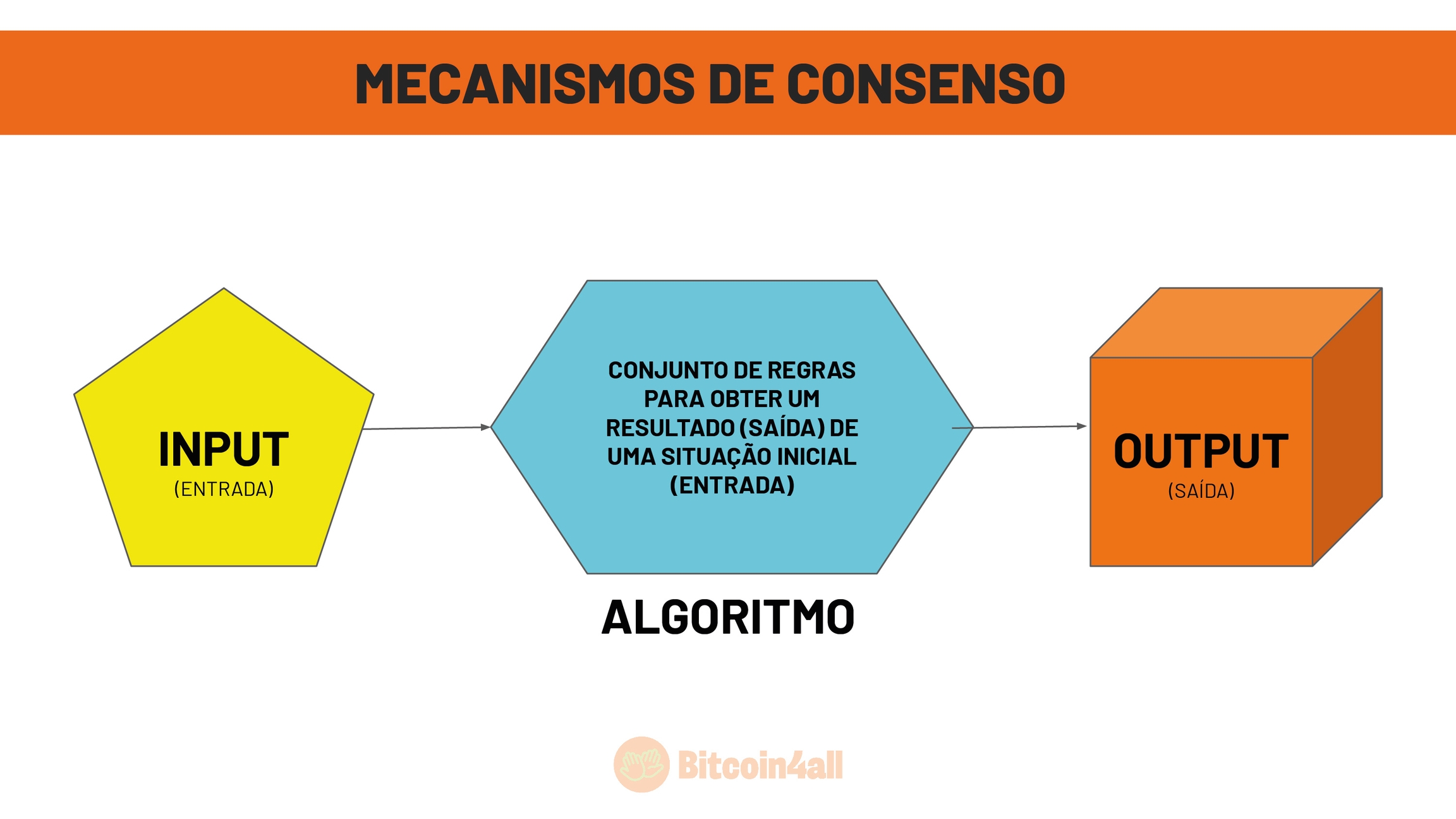 Eu falei agora a pouco sobre Proof of work e mecanismos de consenso, esses termos são as regras que guiam o protocolo. São algoritmos que estabelecem como a rede vai se coordenar. Esse conjunto de regras busca, a partir de uma situação inicial, um input (entrada em portugues), atingir um resultado final, um output (saída em portugues).