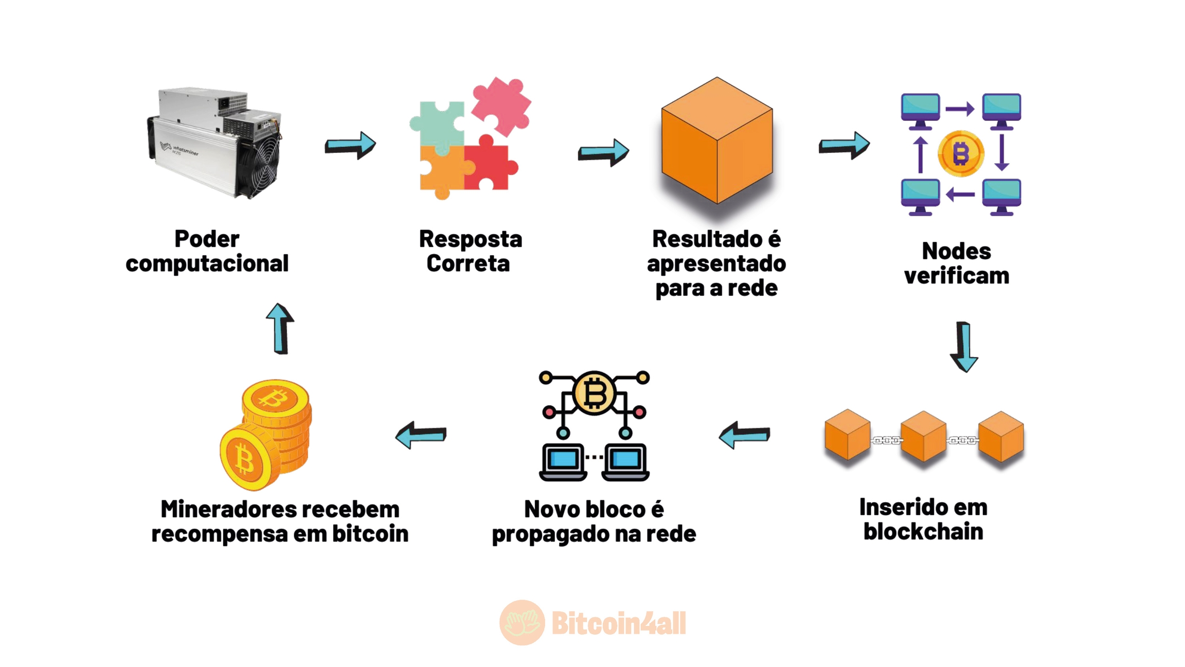 Os mineradores empregam poder computacional, compram máquinas potentes com grande poder computacional para tentar achar o nonce do bloco o mais rápido possível. Quando encontram, eles criam o hash, mostram para a rede, e os nodes verificam se o bloco proposto está seguindo as regras. Se estiver tudo ok, esse bloco é inserido na cadeia de blocos, propagado pela rede e todos os participantes inserem esse bloco em suas cópias da blockchain. E no fim, os mineradores recebem Bitcoin como recompensa por ter cumprido a tarefa.