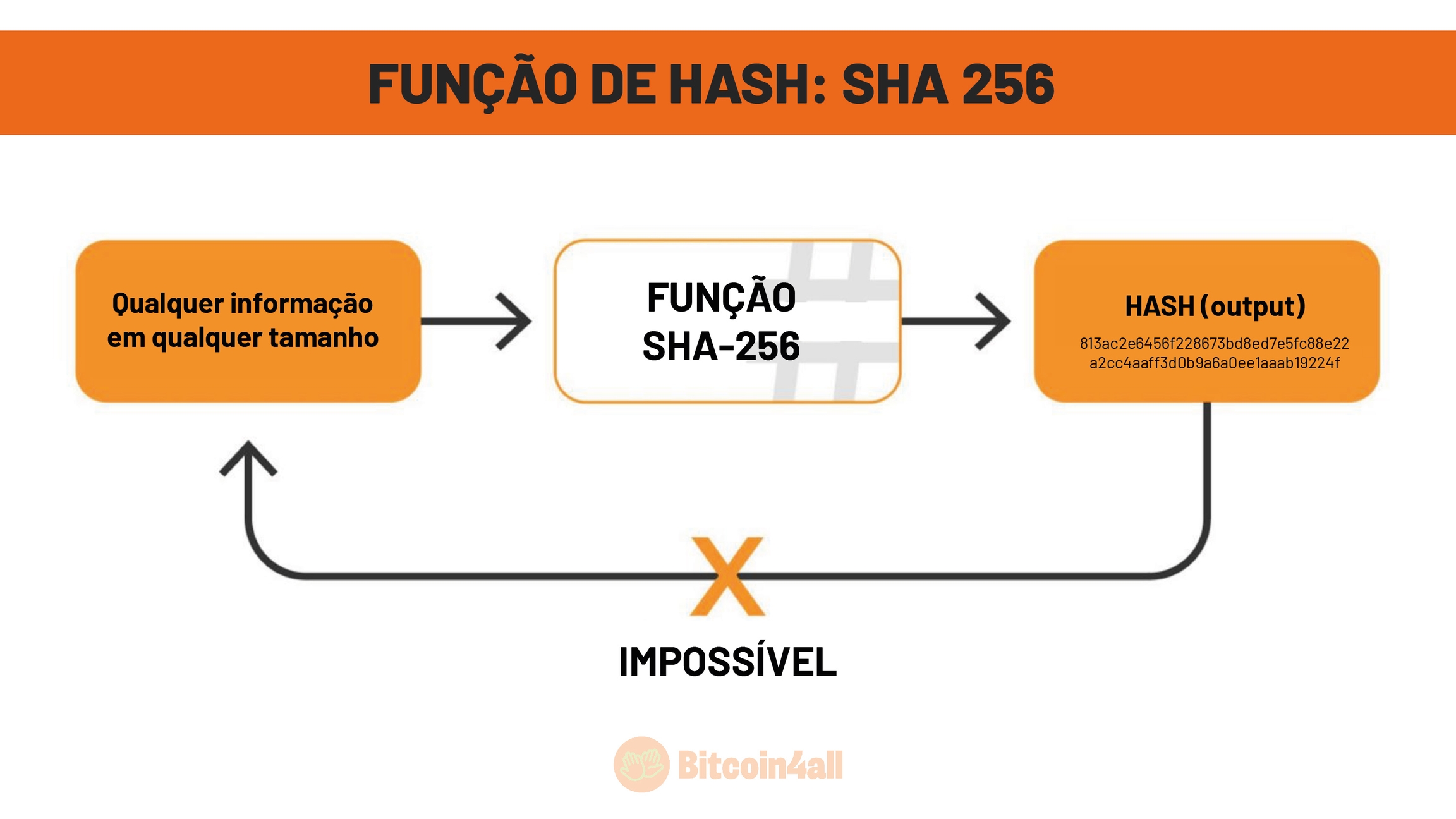 Esse processo não é exclusividade do Bitcoin, mas sim de qualquer que coisa pode ser criptografada, e a SHA-256 é o algoritmo que faz isso. A SHA-256 pega uma informação de qualquer tamanho e cria uma sequência de 256 bits: uma série de 256 zeros e uns. A partir desse número enorme cheio de 01010101 o algoritmo cria uma sequência hexadecimal formada por 64 dígitos entre letras e números mais fácil de anotar. Ou seja, é fácil verificar se está correto, mas é praticamente impossível forjar a informação que foi criptografada.