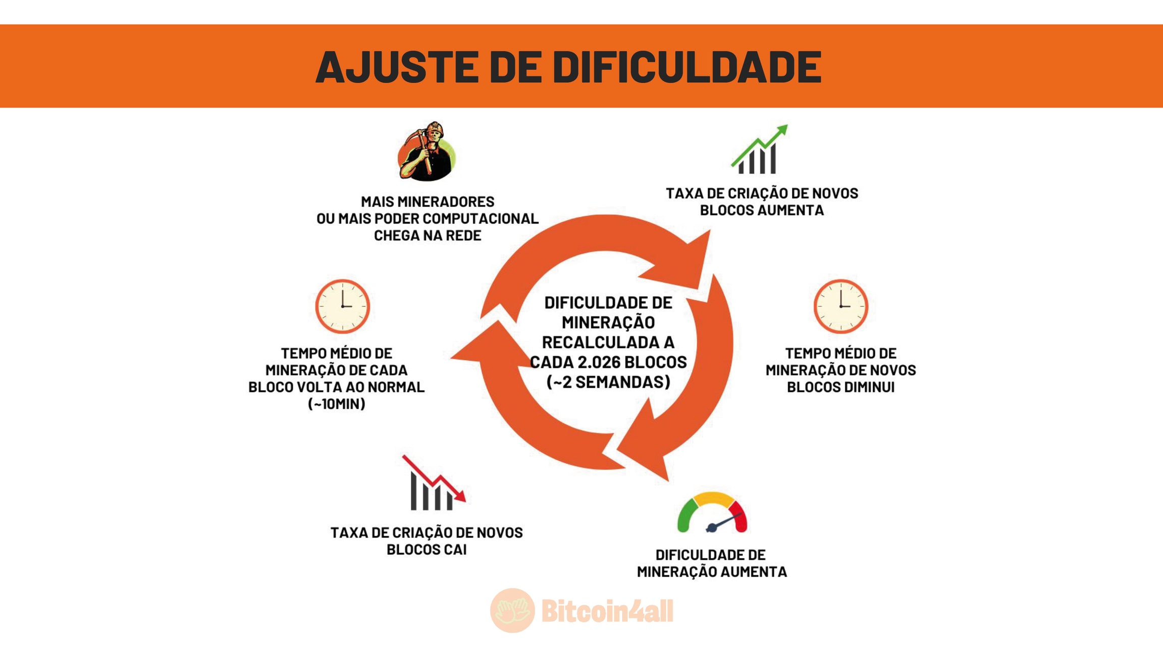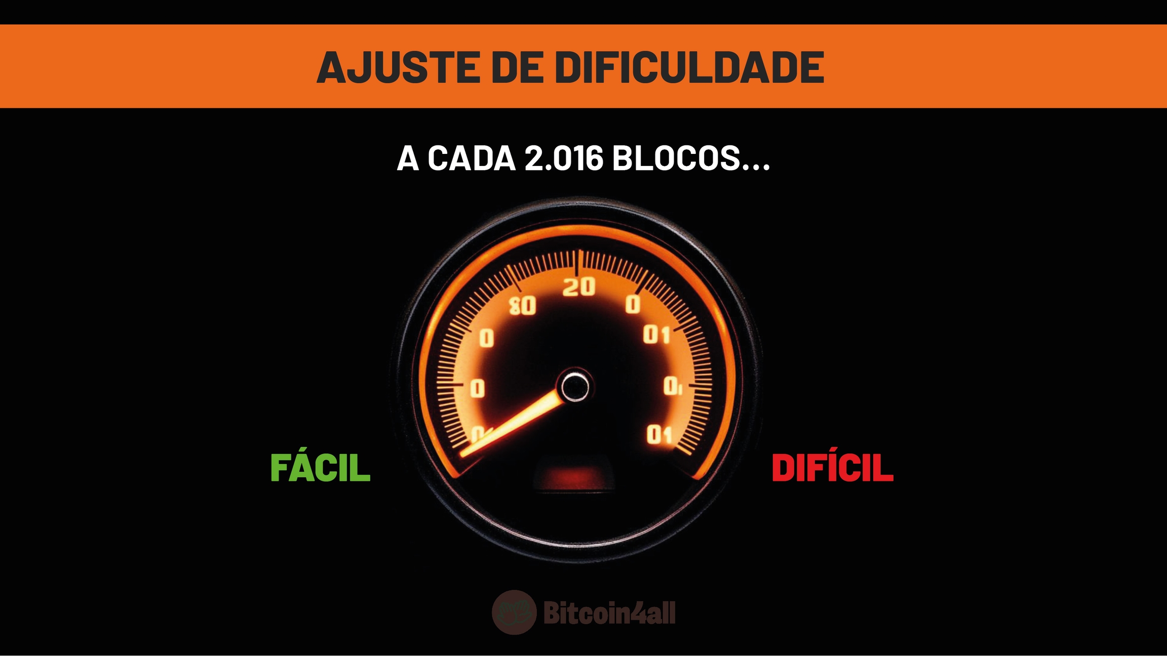 O ajuste de dificuldade tem o papel de regular a emissão de novos Bitcoin. É esse ajuste que garante que a média de criação de novos blocos e a recompensa entregue pela rede seja de 10 minutos. Isso porque a cada 2016 blocos minerados, cerca de 15 dias em média, tem um algoritmo que vai analisar a quantidade de poder computacional da rede e aumentar ou diminuir a dificuldade de encontrar o hash do bloco.