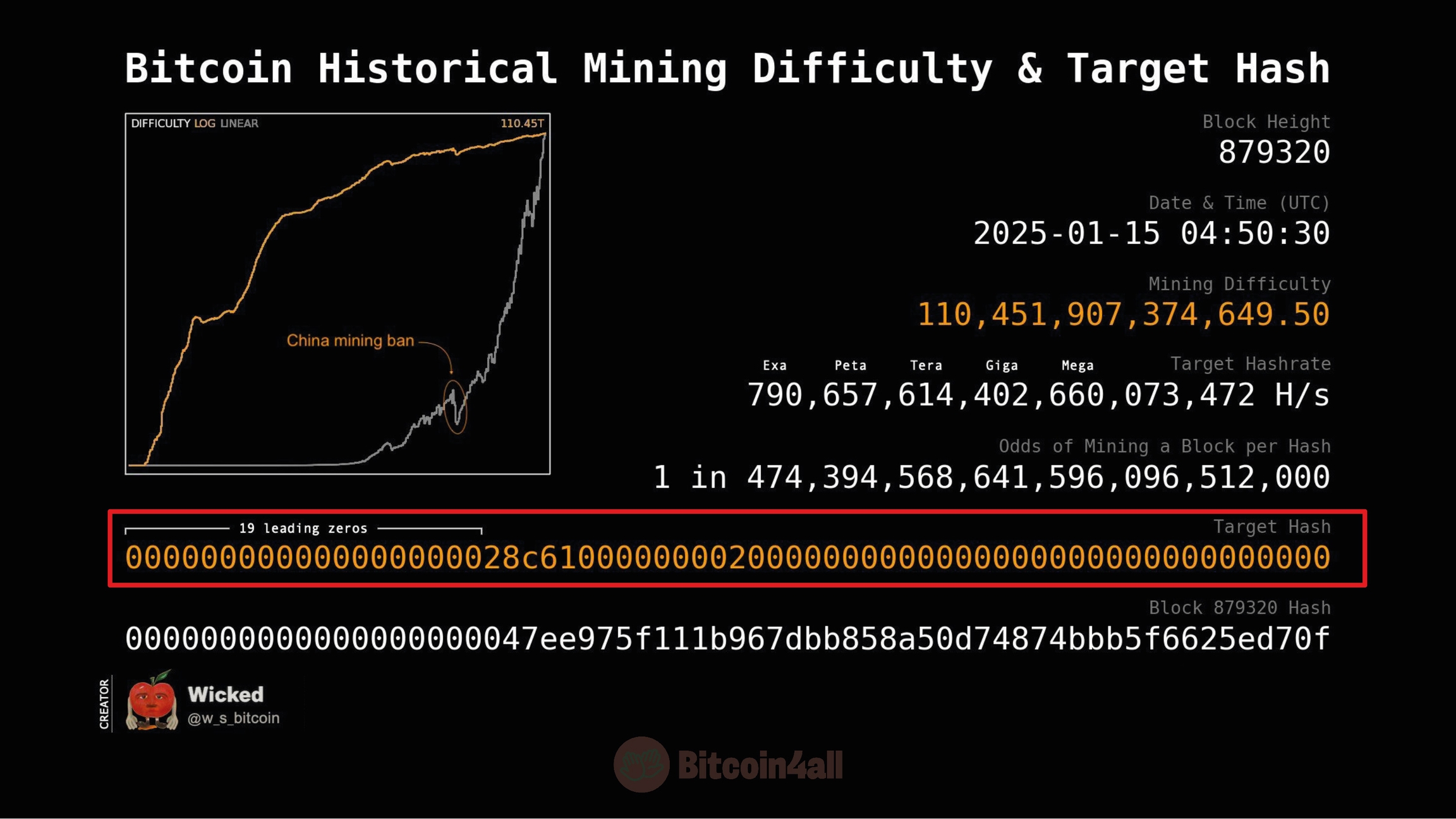 O objetivo do minerador é montar um bloco onde o código hash seja menor que o alvo atual (penúltima linha em branco). Quanto menor o alvo, mais difícil é encontrar um bloco válido. Quanto mais mineradores na rede, mais difícil fica.