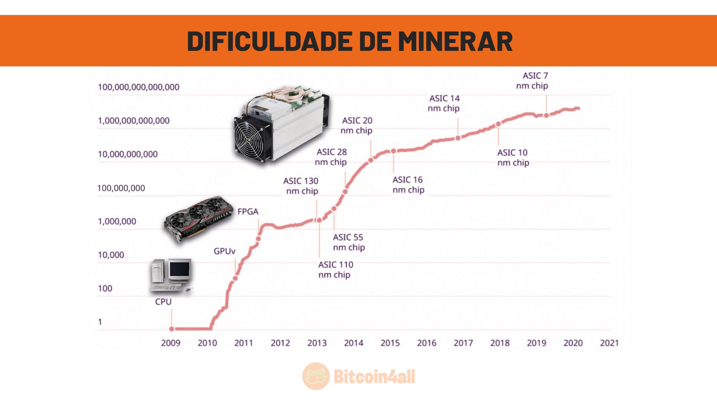 É por causa do ajuste de dificuldade que a mineração evoluiu e não é mais tão fácil minerar do PC de casa, de uma CPU. Hoje a mineração do bitcoin é feita com máquinas específicas chamadas ASICS. Conforme o preço do Bitcoin foi subindo, acabou atraindo cada vez mais pessoas, mais poder computacional foi sendo empregado na rede e com isso o algoritmo de ajuste de dificuldade foi subindo para manter a média de um bloco minerado a cada 10 minutos.