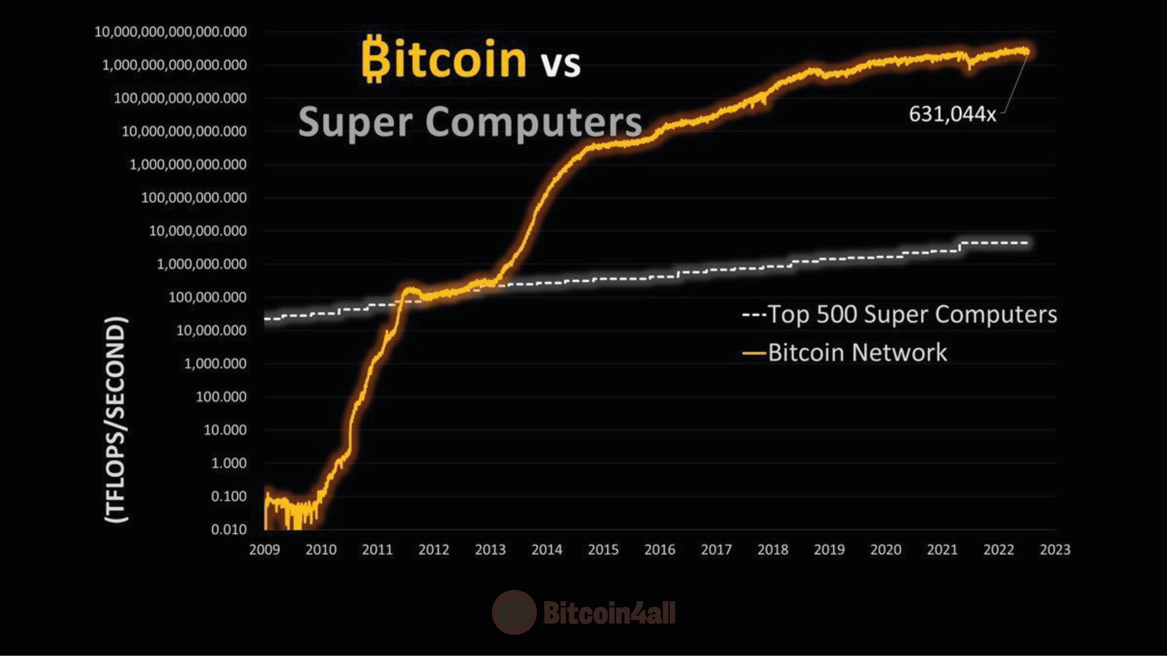 Bitcoin é 631 vezes mais potente que os 500 maiores supercomputadores do mundo combinados, representados na linha branca, e Bitcoin é mostrado na linha laranja. Bitcoin tem a rede computacional mais resistente a ataques e 600x mais forte que qualquer sistema computacional ou data center centralizado.