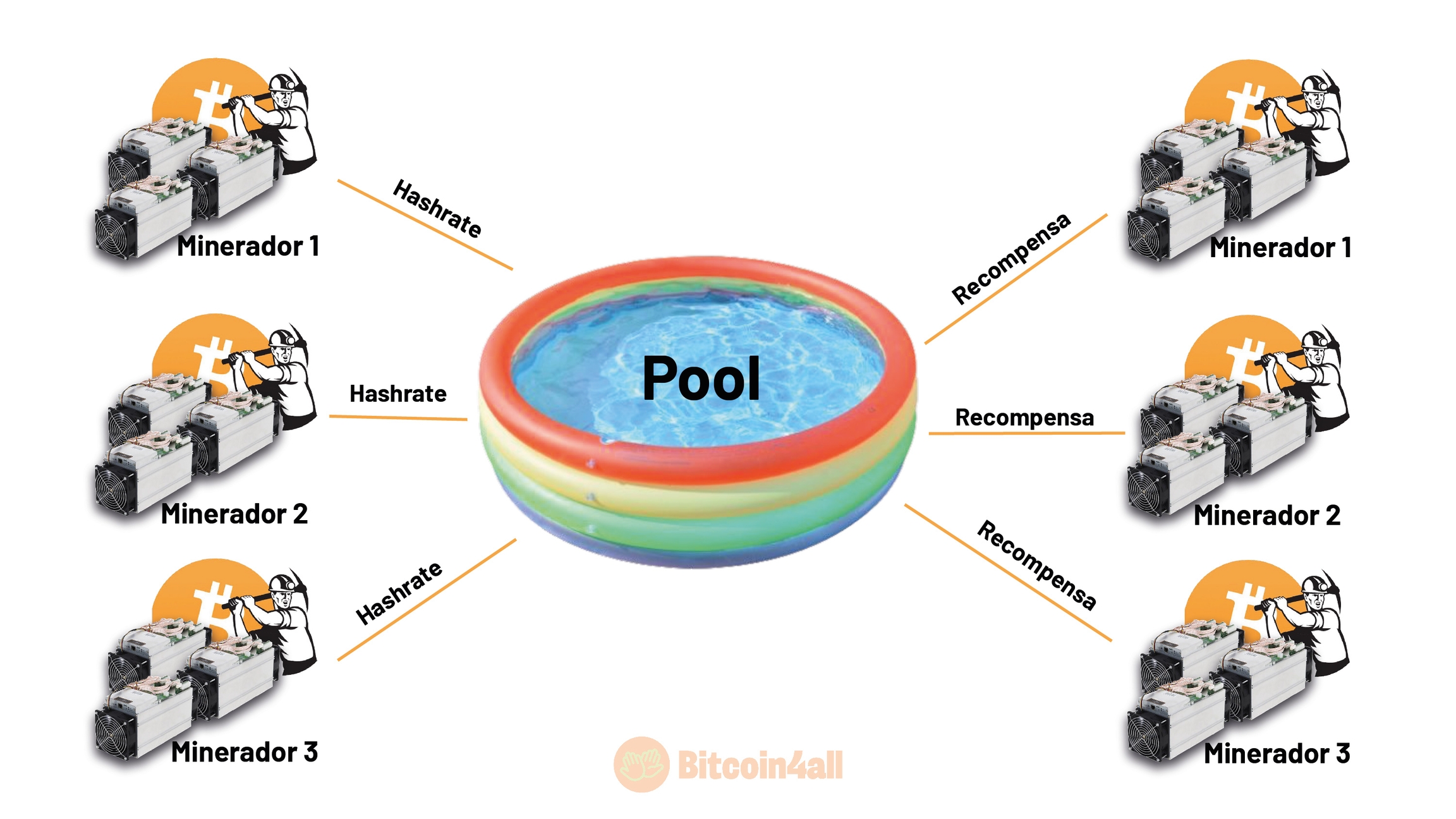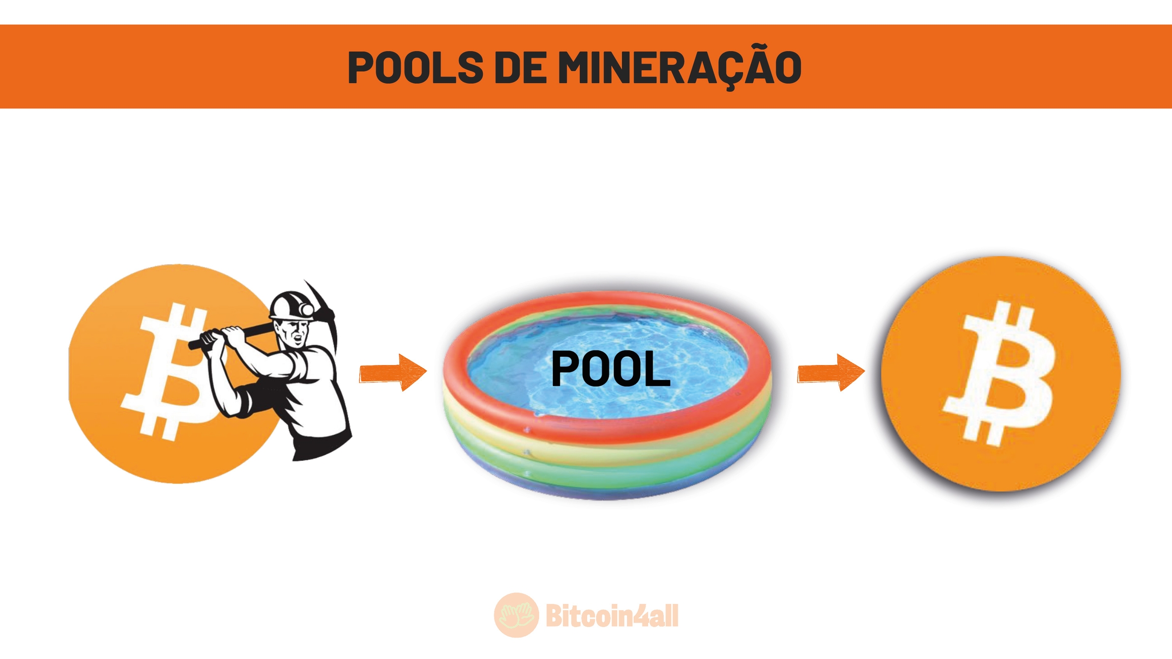 Pools de mineração funcionam entre o software Bitcoin e os mineradores, permite que mineradores agrupem o poder computacional das suas máquinas e tenham mais chances de achar um bloco. Pool vem da palavra piscina em inglês, um concentrado de poder computacional agrupado.