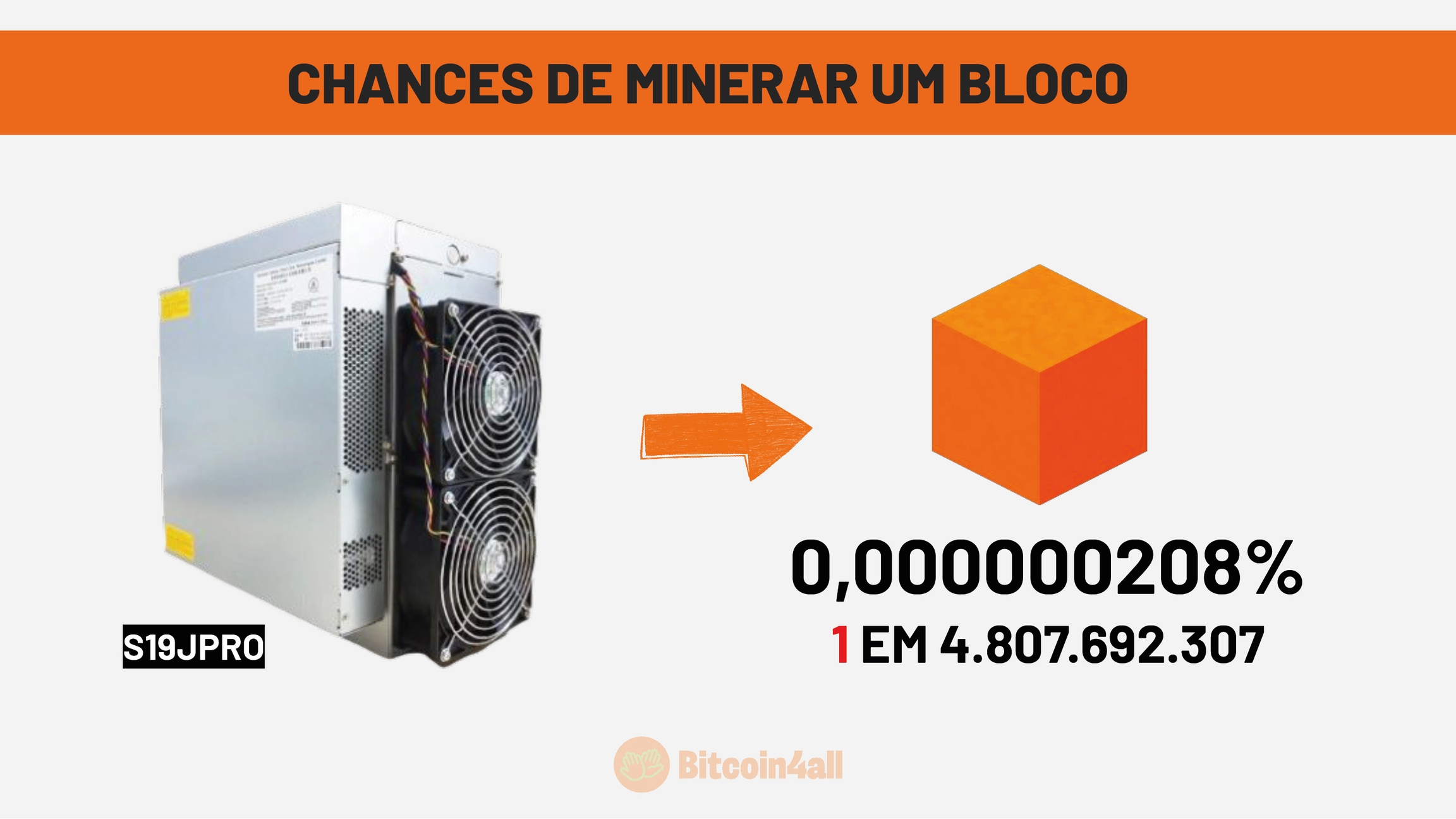 Pra você ter noção da dificuldade que é minerar fora de um pool, ou seja, minerar solo, uma S19JPRO que é uma das máquinas ASICS mais modernas, tem 0,000 000 208% de chance de minerar um bloco de Bitcoin. Isso significa uma chance em quase 4.8 bilhões de tentativas em toda a vida útil da máquina, que dura em média 5 a 8 anos. Essa probabilidade vai continuar diminuindo ao longo do tempo, conforme mais mineradores chegam, o hashrate sobe e a dificuldade aumenta.