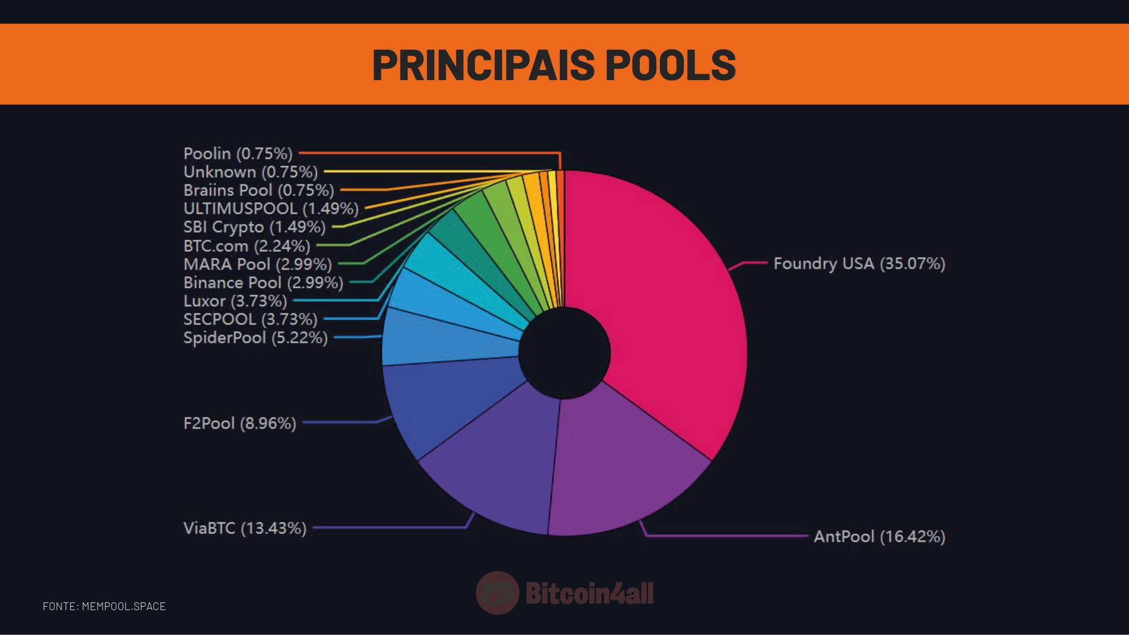 Hoje a rede Bitcoin tem dezenas de pools, mas cinco delas são as maiores e que agregam a maior parte do hashrate: são a Foundry, Antpool, F2Pool, ViaBTC e a Mara. Apesar de muita gente falar que isso seria um mecanismo de centralização, na verdade os mineradores podem sair do pool a qualquer momento e ir para outro, ou podem até minerar solo se quiserem tentar a sorte. Ou seja, a concentração nesses cinco maiores pools foi um movimento de mercado natural dos próprios mineradores querendo estar nos pools com maior probabilidade de achar blocos e compartilhar as recompensas. Os pools não mandam na rede, até porque são os nodes que verificam e decidem se os blocos minerados são válidos ou não.