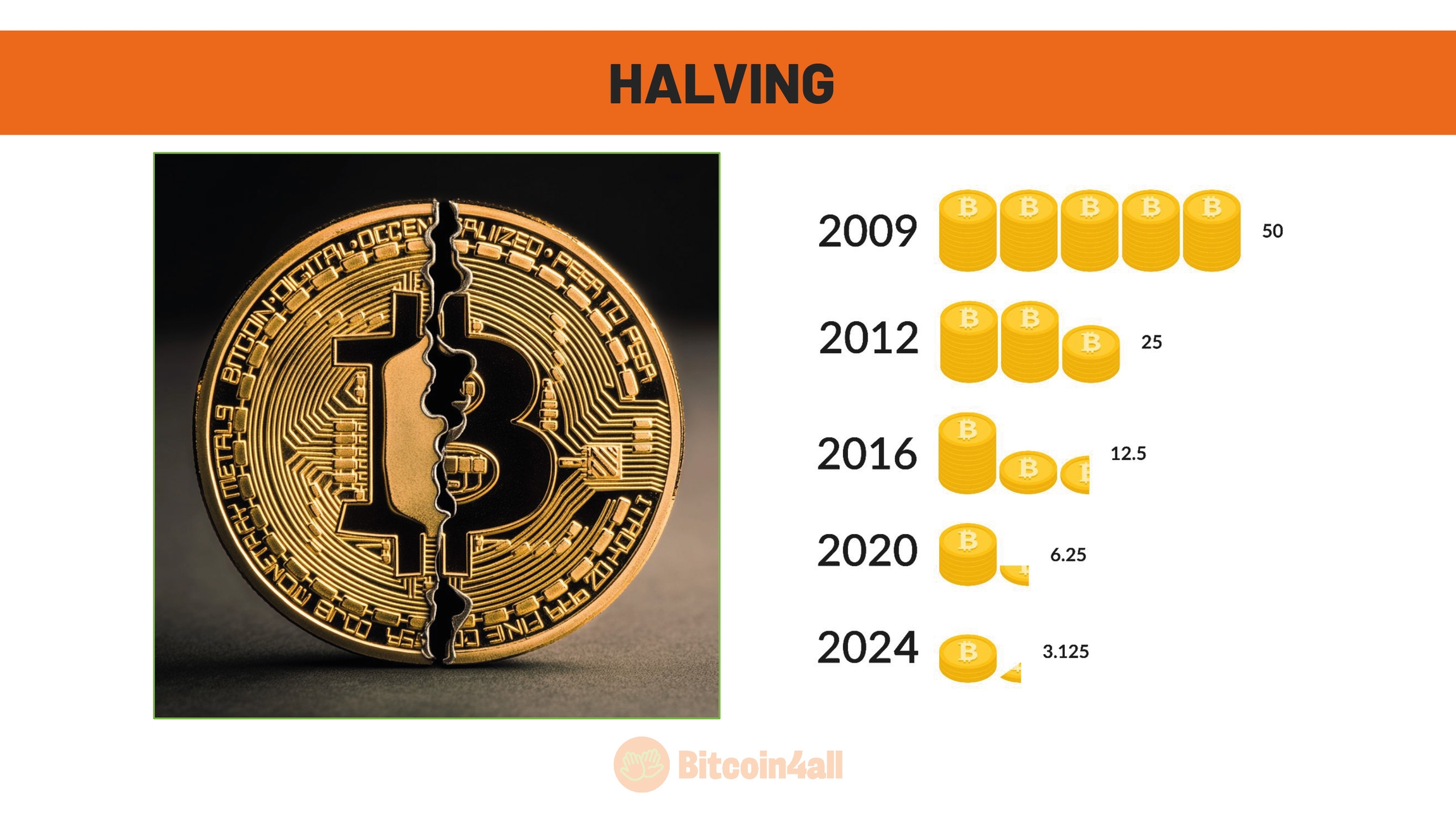 Halving vem da palavra "halfing" e significa "cortar ao meio", em inglês. Quer dizer que a cada 210 mil blocos minerados, em média a cada 4 anos, o protocolo corta pela metade a recompensa entregue aos mineradores.