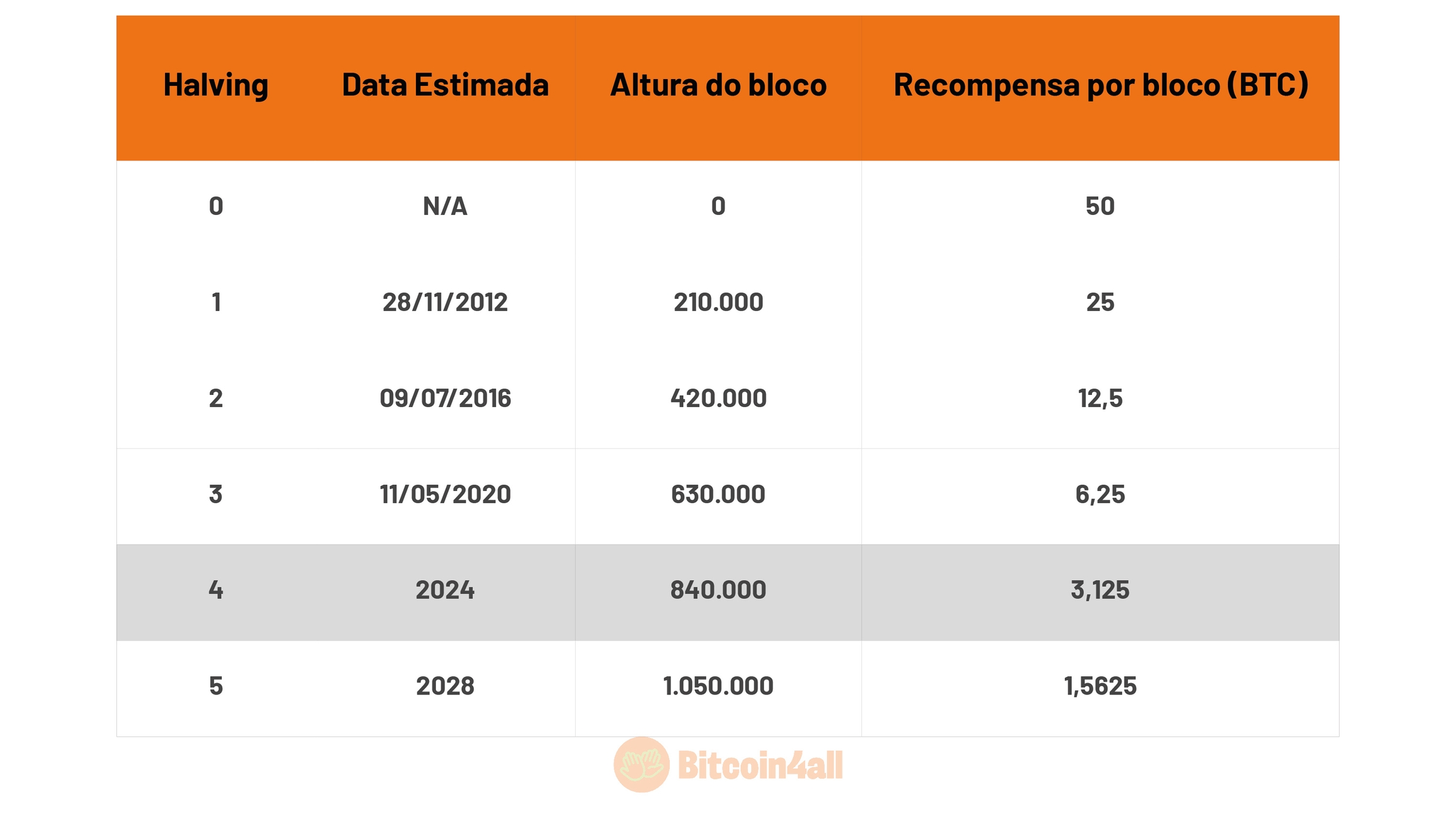 O último halving registrado, o quarto, aconteceu em abril de 2024 na altura do bloco 840 mil. O próximo será em 2028. E o legal de tudo isso é que a gente sabe de antemão em que bloco vai ser, na altura de bloco um milhão e 50 mil. A nova recompensa vai passar a ser de 1,5625 bitcoin para os mineradores.