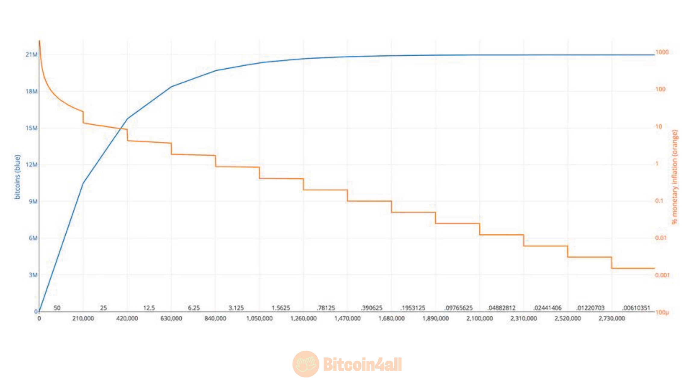 Essa imagem demonstra como a cada degrau da linha laranja, ou seja a cada halving, Bitcoin vai lentamente ficando mais escasso e se aproximando da oferta limite de unidade, na linha em azul.