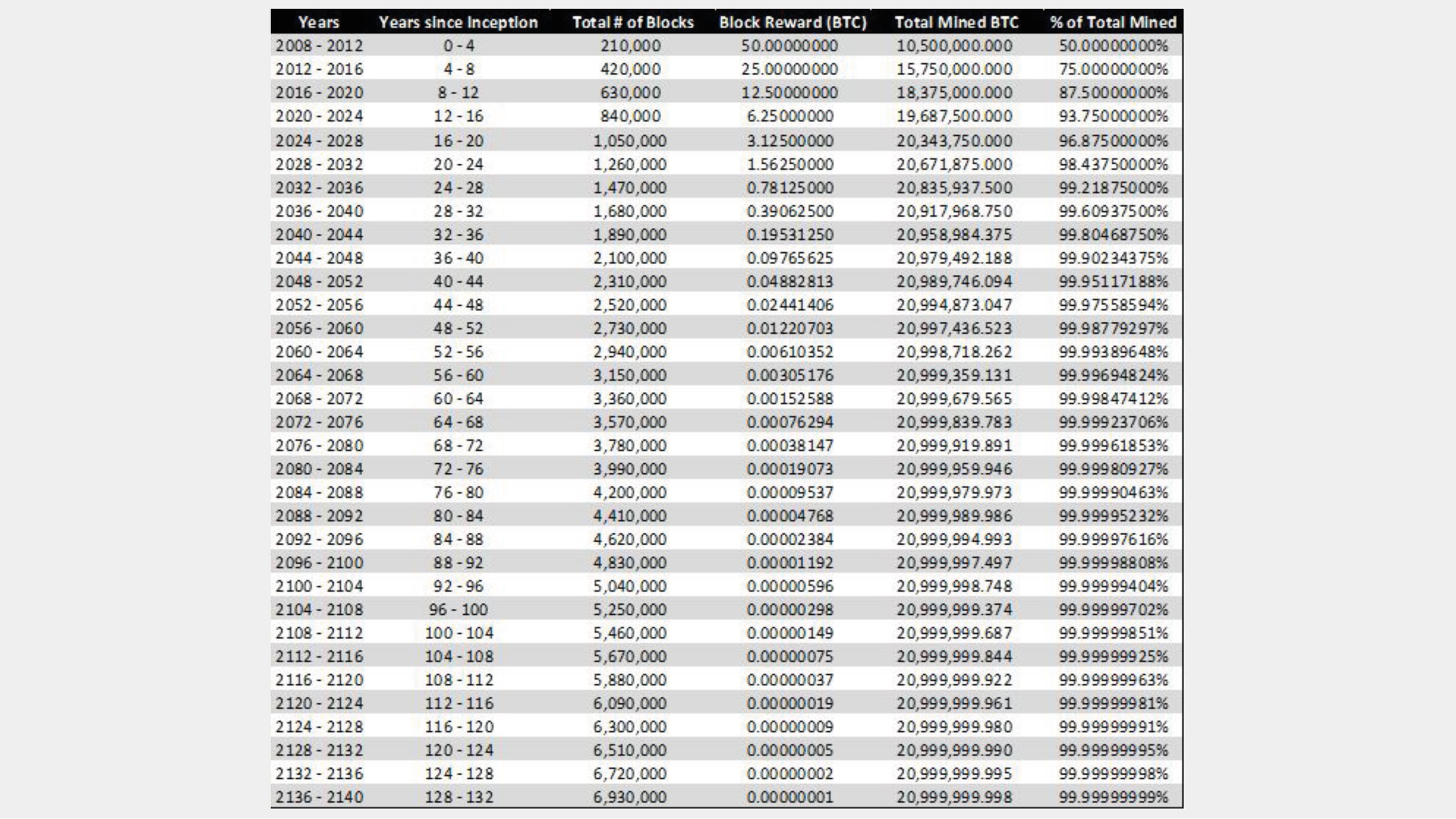 O último satoshi vai ser minerado no ano de 2140 e é quando acaba a emissão de novos bitcoin. Apenas as taxas da rede vão ser a fonte de receita dos mineradores para pagar os custos de operação.