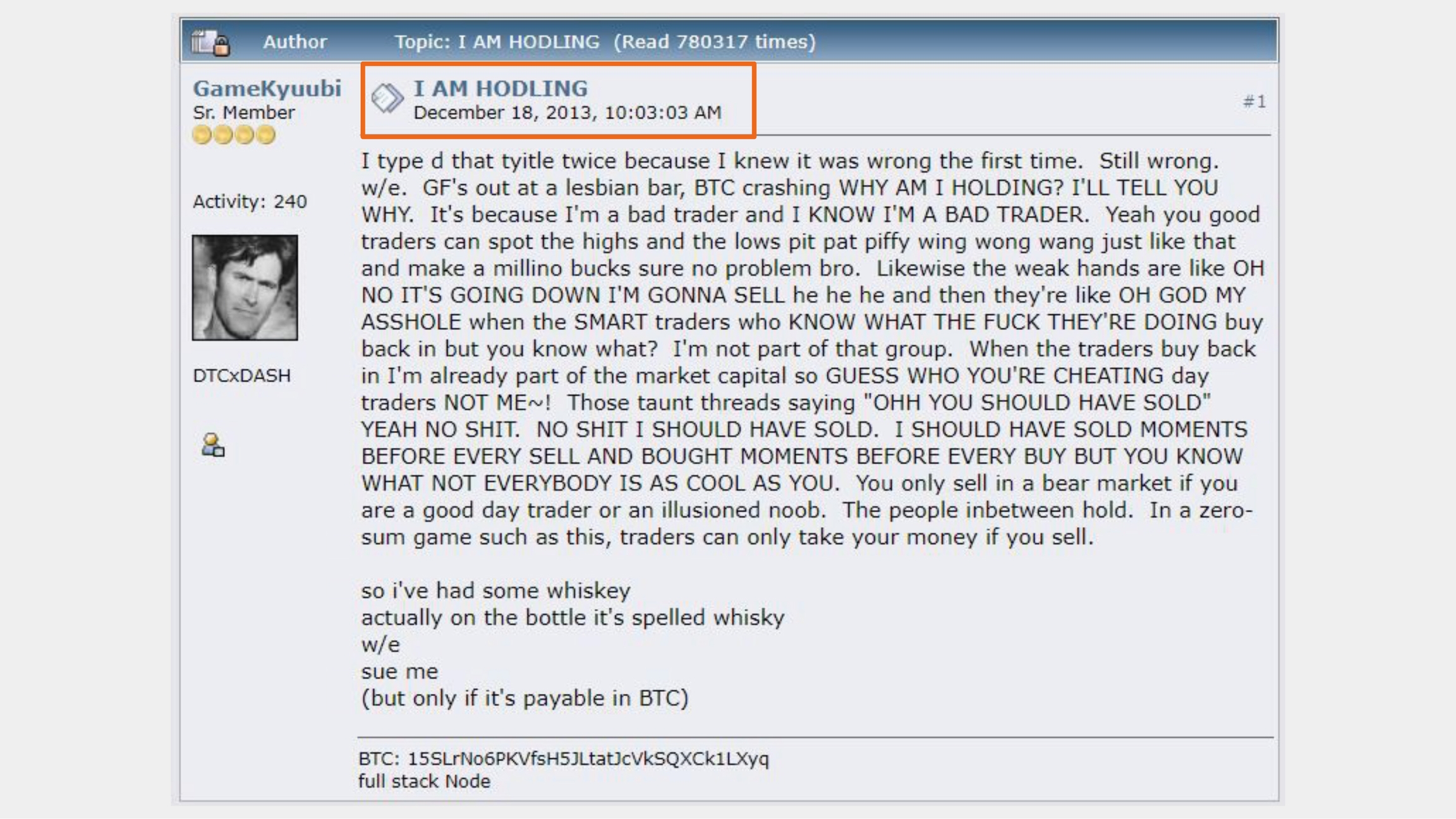 Hodlers são os bitcoiners que acumulam bitcoin para o longo prazo e não vendem nem nas maiores quedas de curto prazo. O termo hodler virou um meme porque um cara no bitcoin talk, um fórum famoso de bitcoin, digitou errado e o pessoal adotou a gíria para diferenciar da galera de bolsa tradicional. Essa imagem na tela é o print da postagem que deu nome aos hodlers: bitcoiners que seguram bitcoin com força e não vendem de jeito nenhum.