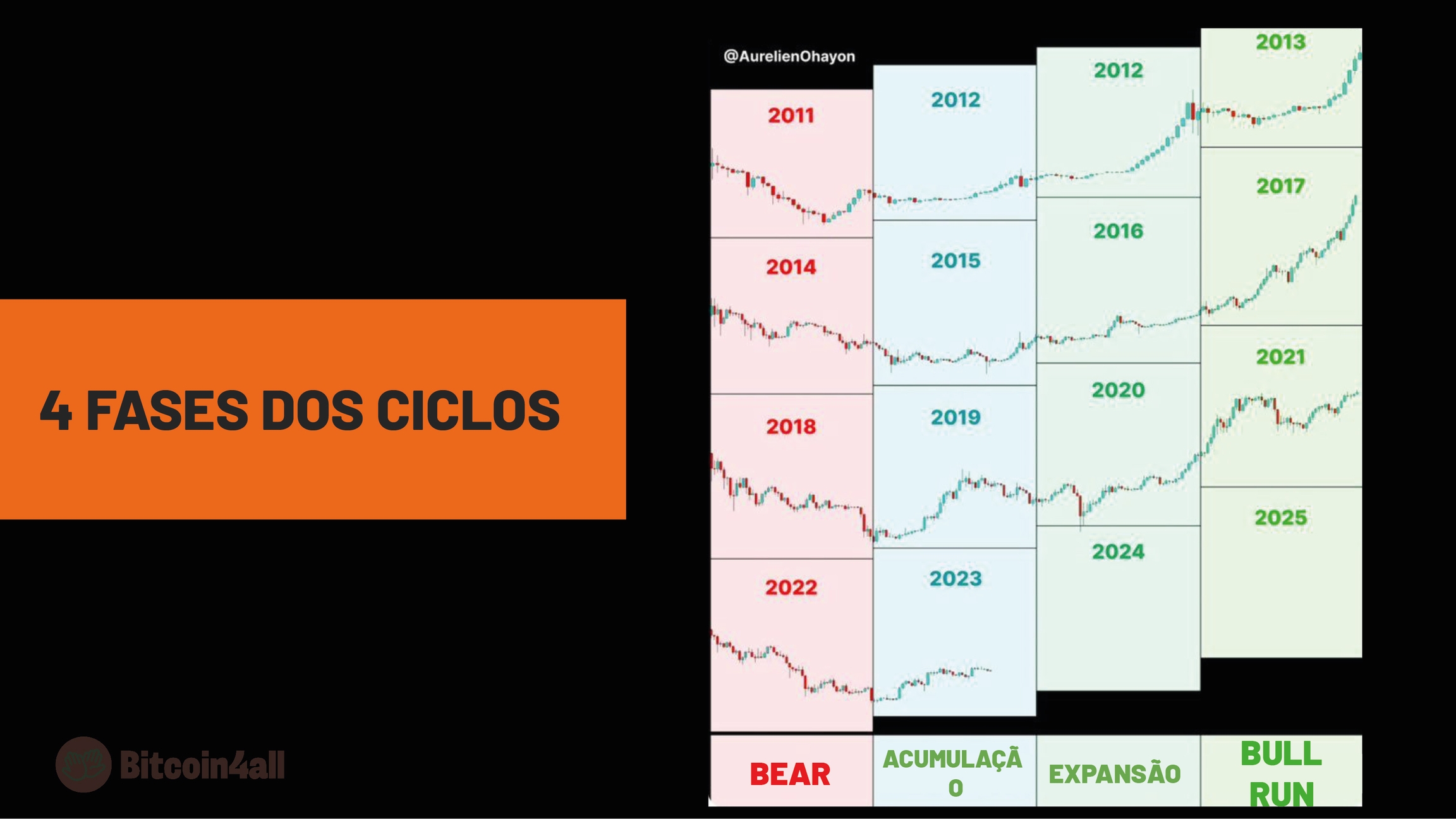 Os ciclos do Bitcoin são formados por quatro fases. A primeira fase é o BEAR, quando o mercado é dos ursos. É quando o preço cai muito após um período de alta e é quando quem entrou na alta vai embora. 2011, 2014, 2018 e 2022 foram anos de bear do Bitcoin. É quando só sai notícia negativa e quem estava de turista no Bitcoin, vai embora.