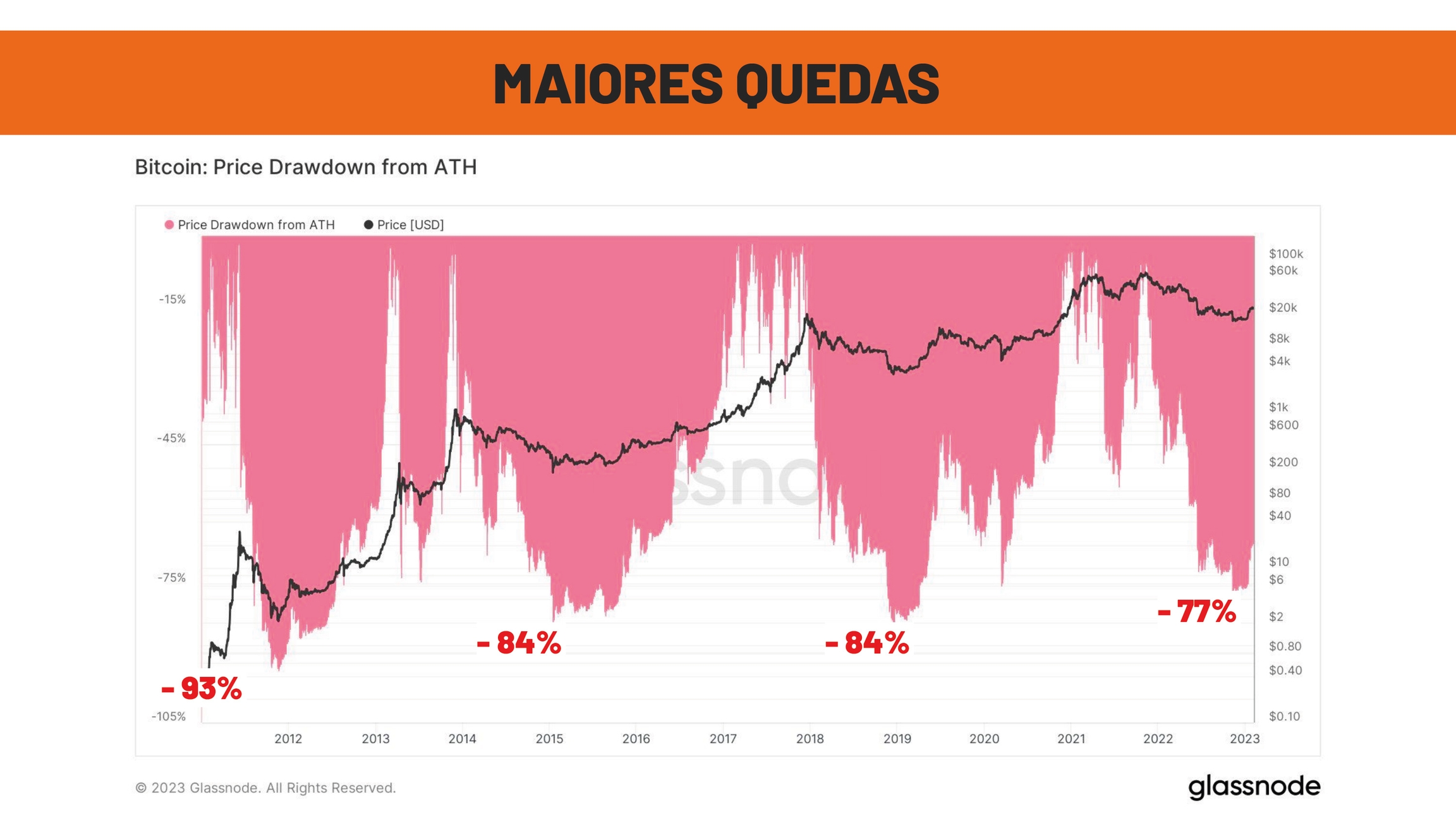 Em 2012 Bitcoin teve um queda brutal de 93%, depois do primeiro halving 84%, no segundo caiu 84% de novo e no último halving a queda foi de 77%, menor que nos bears anteriores. Significa que ao longo do tempo bitcoin está ficando menos volátil. Óbvio que está longe de andar em linha reta, mas já é possível observar essa tendência.