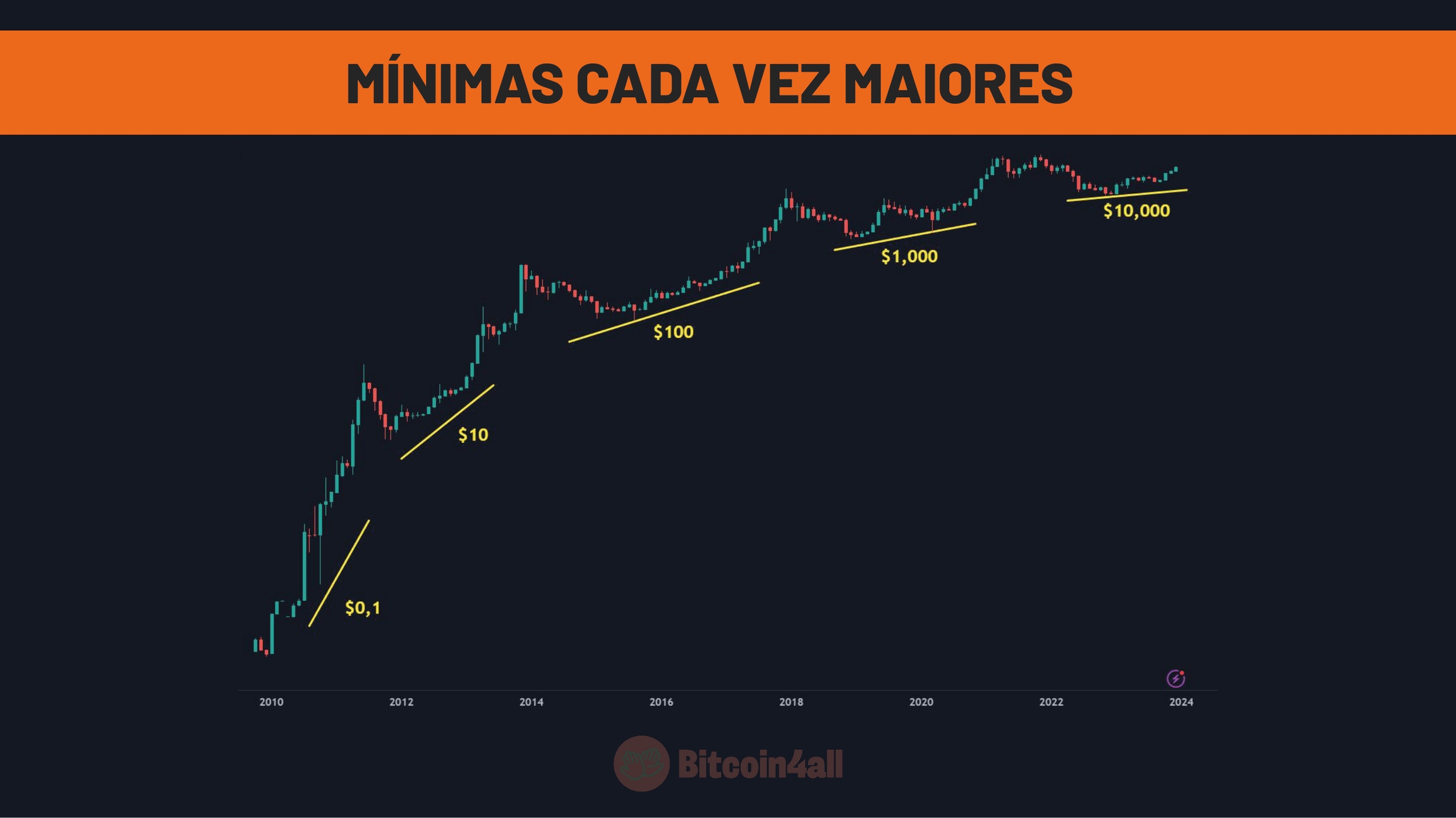 O que se observa também é que Bitcoin tem tido mínimas cada vez maiores ao longo dos ciclos. Em 2012 bitcoin valia menos de um dólar, em 2014 a mínima já foi dez dólares, em 2016 cem dólares, em 2019 mil dólares e em 2022 dez mil dólares.