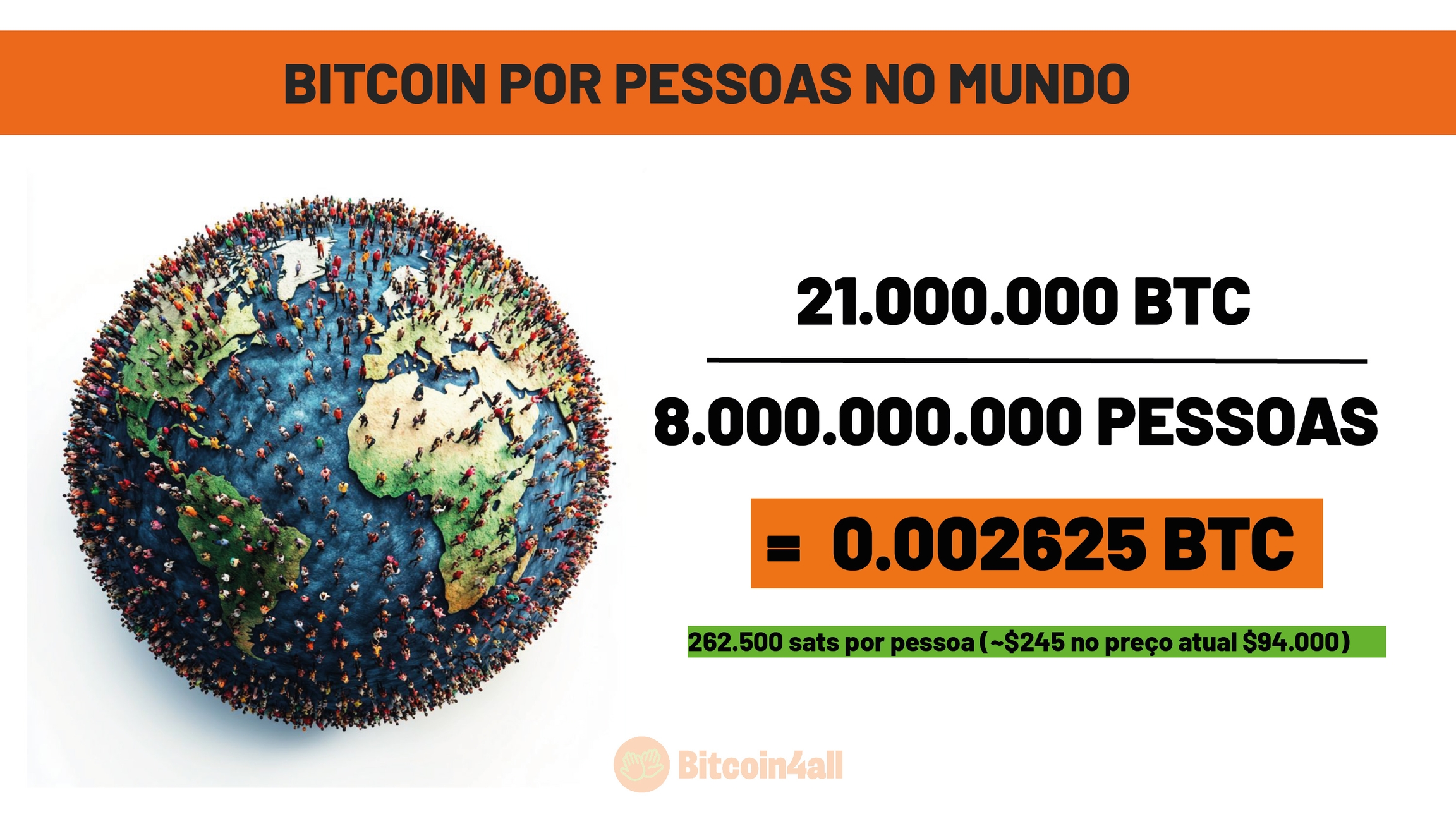 Hoje, o mundo tem cerca de 8 bilhões de pessoas. Como o Bitcoin tem um limite máximo de emissão de 21 milhões de unidades, que vão ser emitidas até o ano de 2140 e a maior parte desses já foi minerada, isso significa que, se todas as pessoas no mundo quisessem ter Bitcoin, cada uma poderia ter no máximo 0,002625 BTC. Isso equivale a aproximadamente 260 mil satoshis, ou cerca de 245 dólares, considerando o preço atual de 94 mil dólares por Bitcoin.