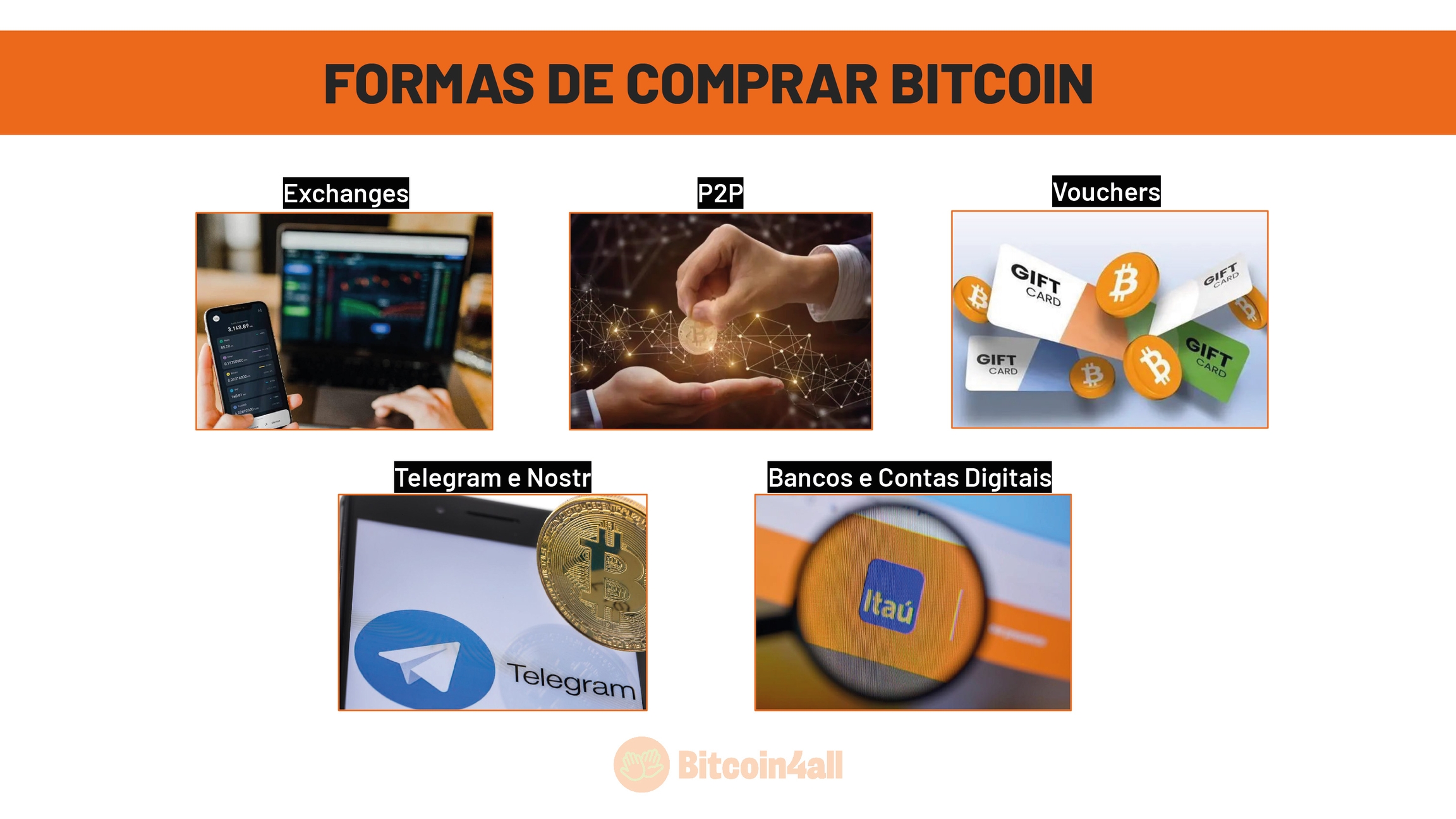 E quando de trata de comprar bitcoin, existem diversas maneiras de fazer isso. Você pode comprar através de exchanges, que são plataformas que funcionam como casas de câmbio digitais. Você pode comprar de outra pessoa que tem Bitcoin, o famoso P2P (peer-to-peer). Você pode comprar vouchers ou vale-presentes que podem ser resgatados em Bitcoin. Você pode comprar através de redes sociais que tem canais de compra e venda de Bitcoin como no Telegram ou no Nostr. E por fim, atualmente até bancos vendem Bitcoin e você pode comprar através deles.