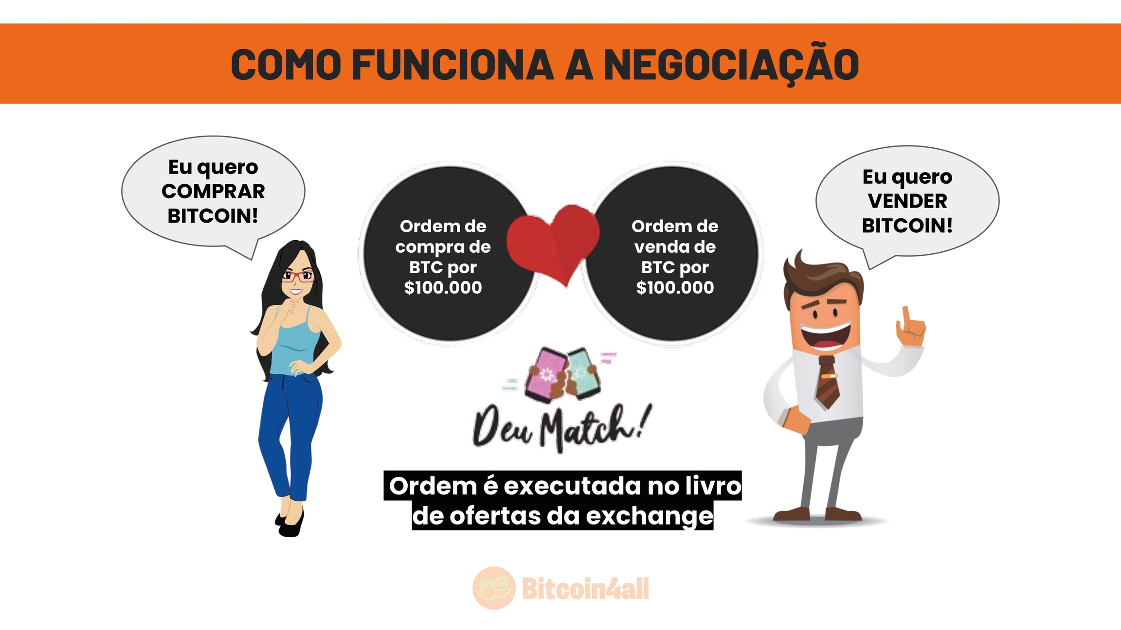 A Ana colocou uma ordem de compra de bitcoin na cotação de 100 mil dólares e o João criou uma ordem de venda de bitcoin na cotação de 100 mil dólares. Então, aqui nesse exemplo, um quer comprar e o outro quer vender pelo mesmo valor da cotação do bitcoin naquele momento. E assim essa negociação deu match. As ordens de um e de outro são executadas na corretora, o saldo de bitcoin do João é liquidado em fiat e a Ana recebe na conta dela dentro da exchange o saldo em bitcoin que antes era do João.