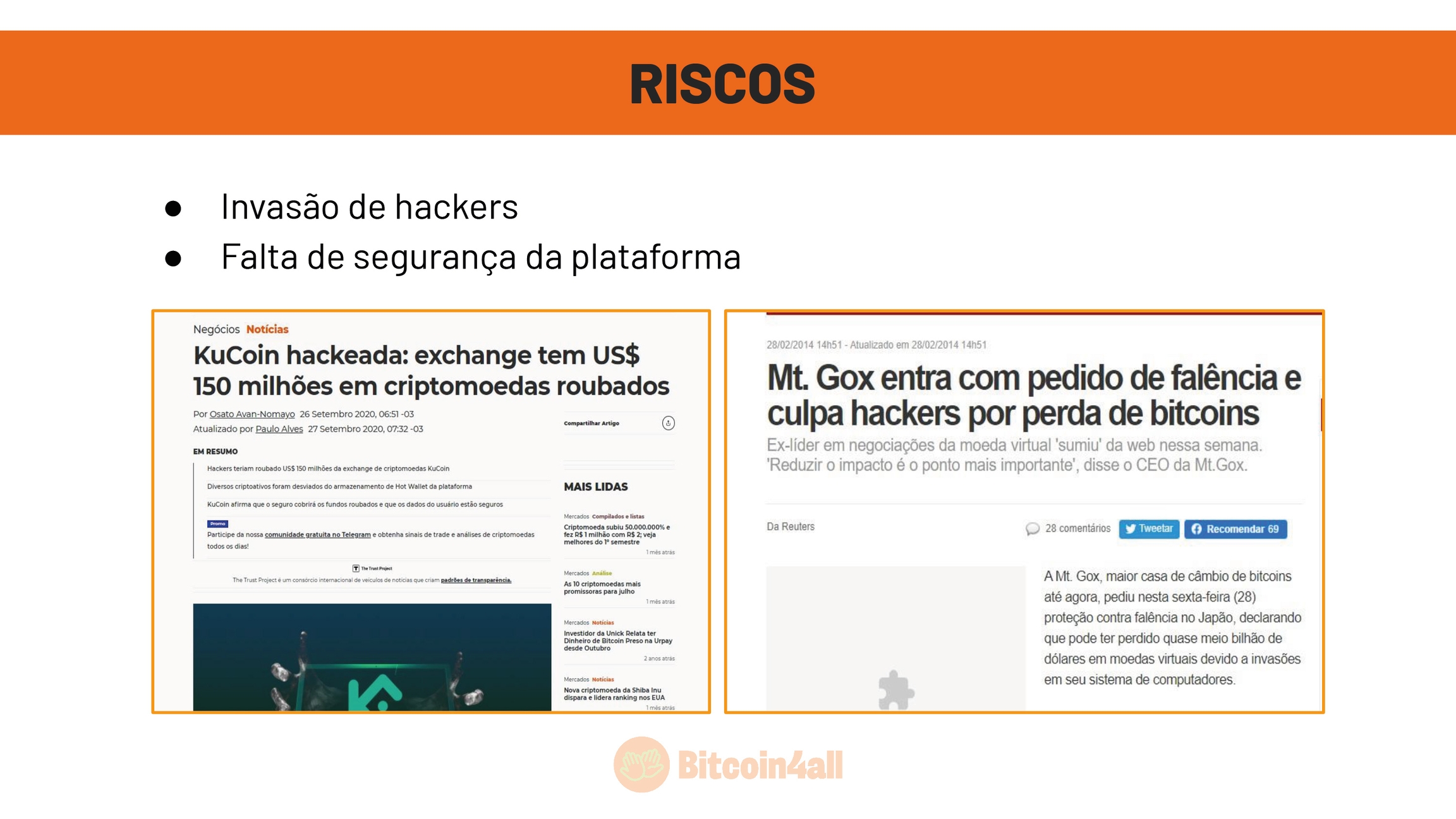 A ideia da regulação é eliminar os maus atores do mercado, mas mesmo assim não impede que essas empresas falhem por má gestão ou por hacks. Nas exchanges o maior risco são as invasões de hackers e vazamentos de dados privados. Já aconteceu no passado de hackers invadirem exchanges e roubarem os saldos em bitcoin e isso levou várias exchanges a fecharem suas portas.