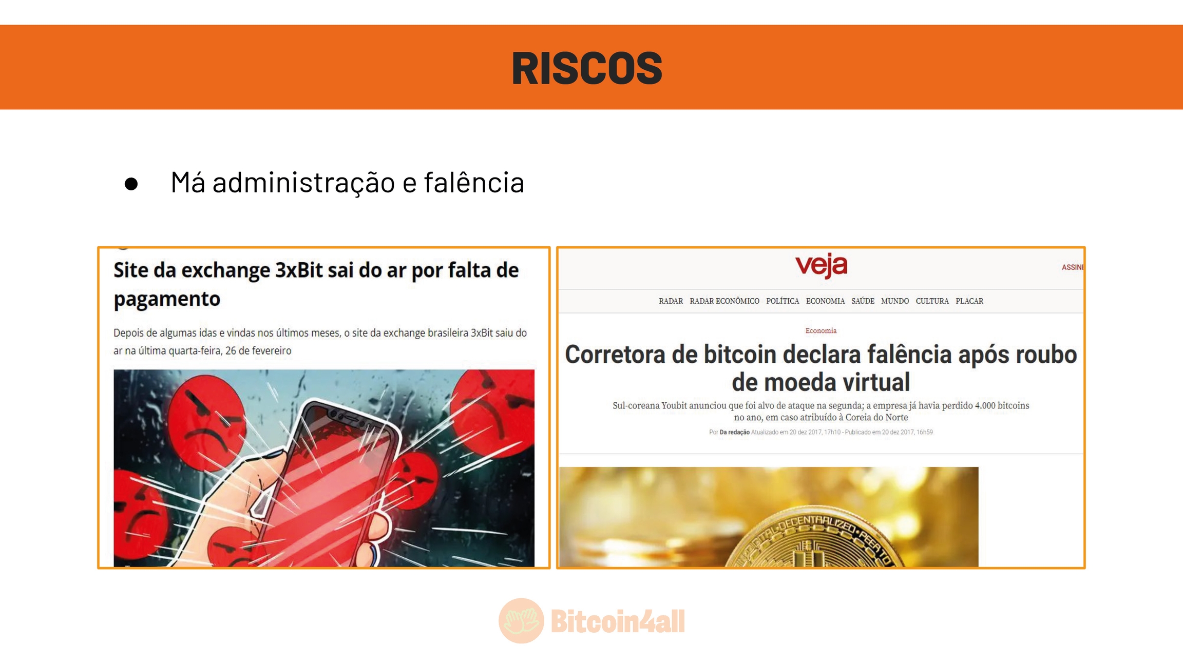 Outro risco é o de falência. No caso dos sócios e gestores não saberem administrar o negócio, ou fazerem operações ilegais, como aconteceu com a FTX, e a exchange falir. Se um ataque hacker acontecer ou a corretora falir, pode levar anos de processo judicial pra que você tenha o valor devolvido ou pode acontecer de nunca receber de volta seu bitcoin. Muita gente já perdeu Bitcoin assim.