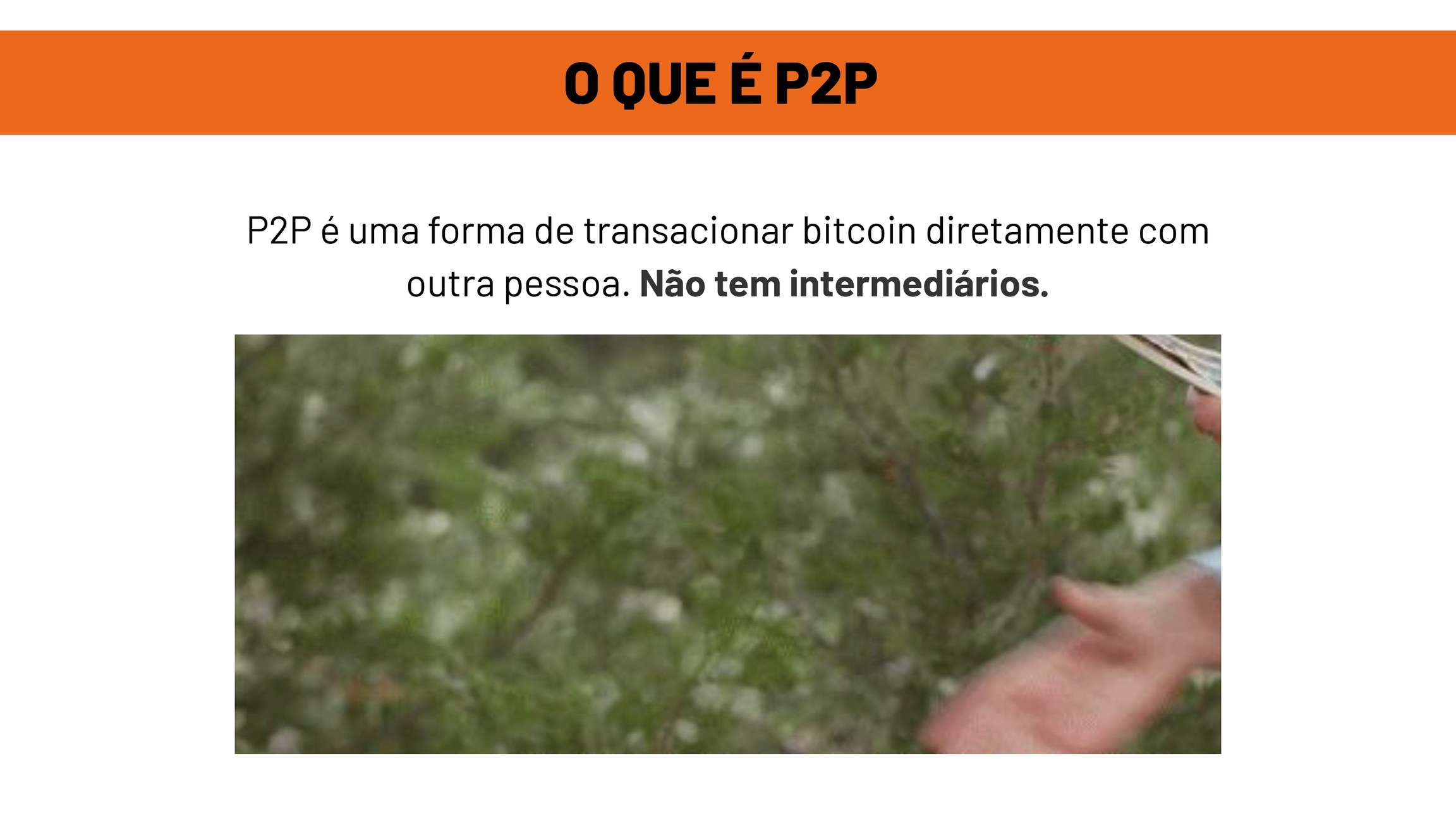Você lembra do whitepaper da Bitcoin? O que estava escrito nele? Satoshi escreveu no título do white paper "Bitcoin: um sistema eletrônico de pagamentos ponto a ponto, de pessoa para pessoa", e no início da rede Bitcoin as negociações eram basicamente feitas assim, diretamente entre as pessoas. Hoje em dia, mesmo com tantas exchanges e contas digitais pra escolher, a forma P2P de negociar segue firme e forte e provavelmente nunca vai deixar de existir, porque por mais que algum país proíba o uso de bitcoin, ele é descentralizado e open source, então não tem como impedir que as pessoas negociem entre si de forma P2P.