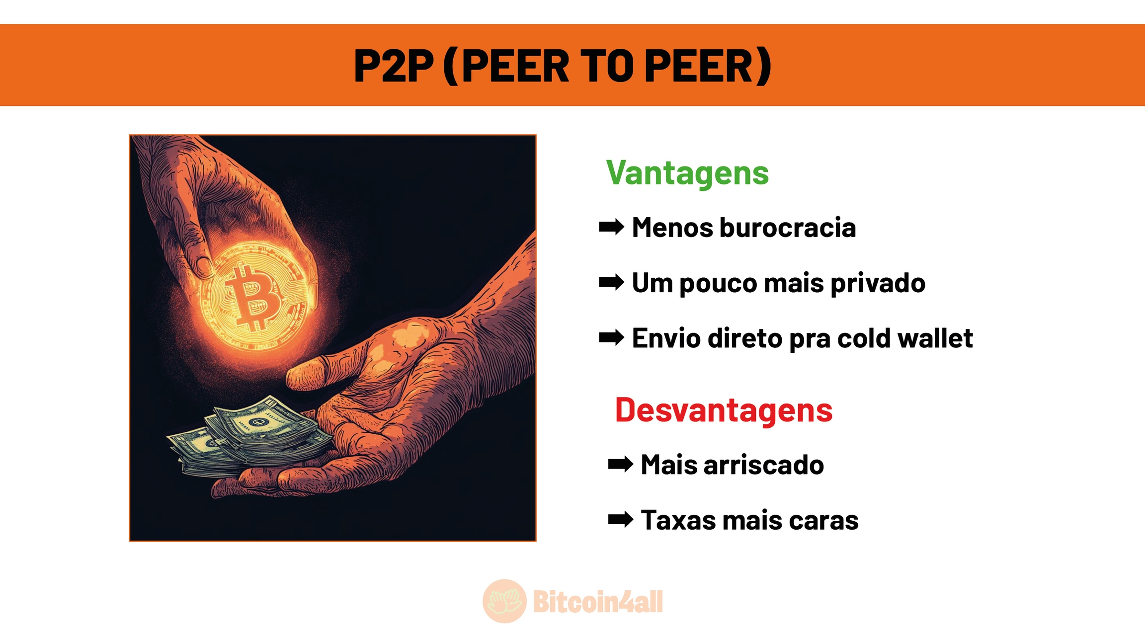 Outra vantagem é que o P2P manda o saldo em bitcoin direto pro endereço, que pode ser o da sua cold wallet, por exemplo. É bem prático e um passo a menos pra você fazer. Por outro lado, tem desvantagens e riscos. Como é tudo geralmente feito online de forma direta, não tem uma empresa intermediando, então é você que tem que se certificar de que o P2P que escolheu é de confiança. Você precisa confiar que a pessoa não vai sumir com o seu dinheiro e que você vai receber de volta o equivalente em bitcoin na sua carteira. Existem P2P que trabalham há muito tempo no mercado e que são pessoas honestas, mas tem gente golpista também, como em todo mercado.