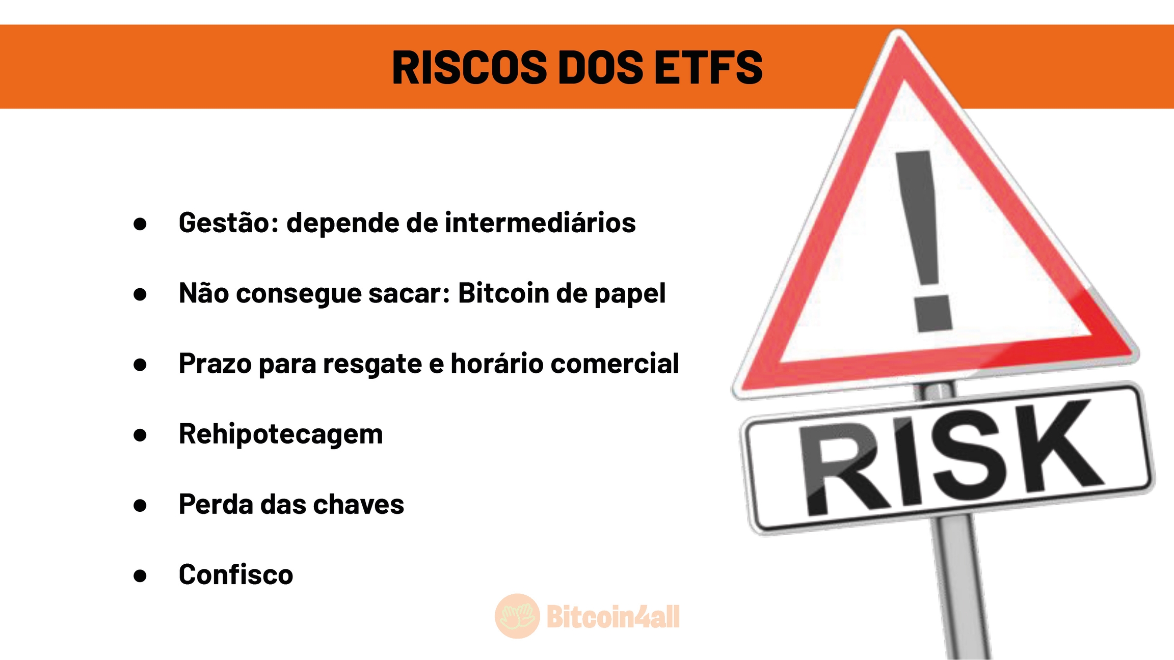 Outro risco é o mau gerenciamento das chaves privadas dos bitcoin que eles tem sob gestão. Algumas gestoras fazem a custódia dos bitcoin dos clientes, mas a maioria dos ETFs usam exchanges para custodiar os bitcoin que eles vendem. A Coinbase por exemplo custodia os bitcoins da maioria dos ETFs americanos. Nesses casos o risco é desses terceiros custodiantes, dessas exchanges, falirem ou fazerem uma má gestão das chaves.