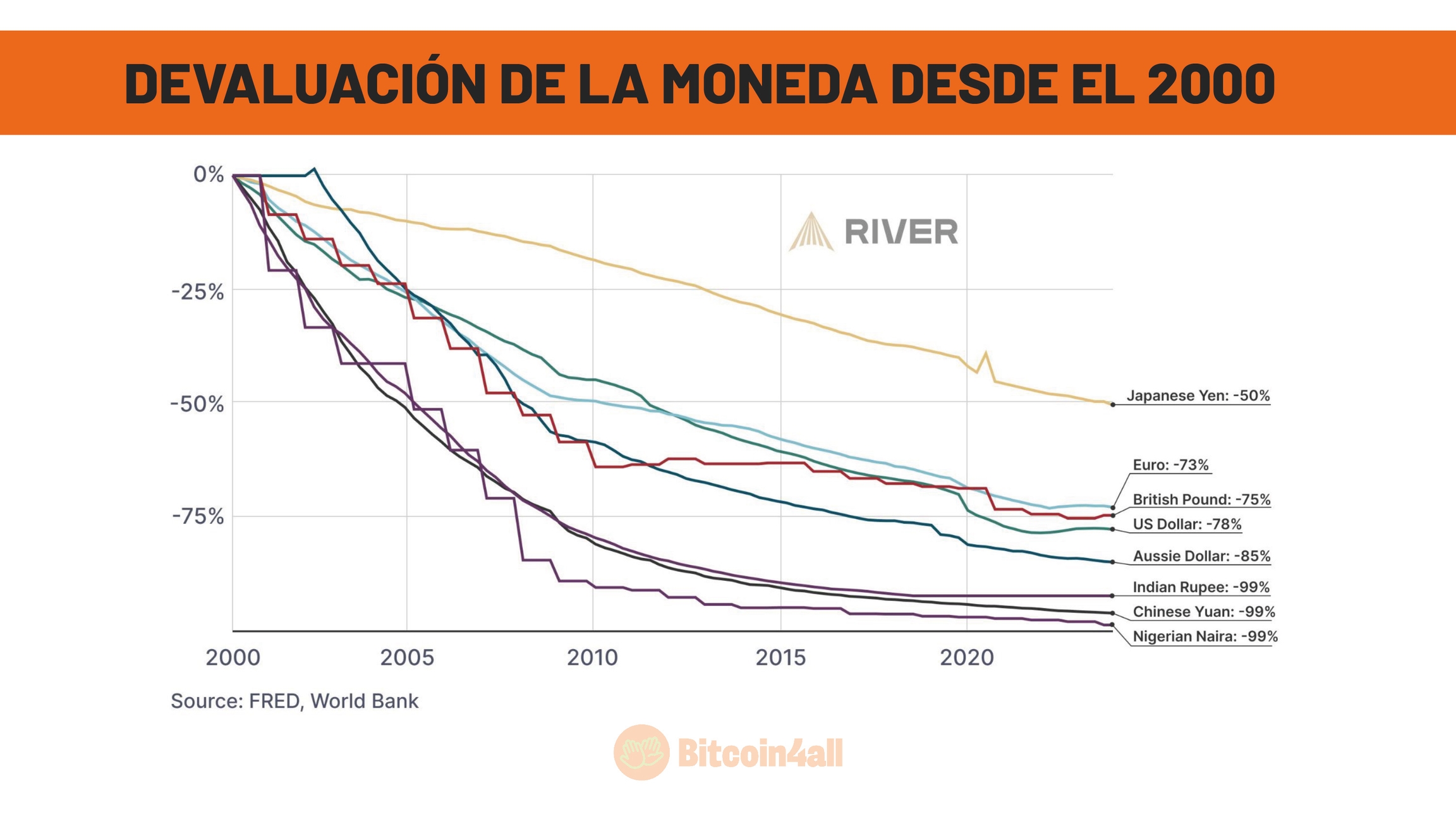Según los datos del Banco Mundial, todas las monedas mundiales han perdido valor desde la década de 2000, es decir, en los últimos 25 años. El yen japonés perdió un 50% de valor, el euro un 73%, la libra esterlina un 75%, el dólar estadounidense un 78%, el dólar australiano un 85%, la rupia un 99%, el yuan chino un 99% y la naira nigeriana también un 99%.