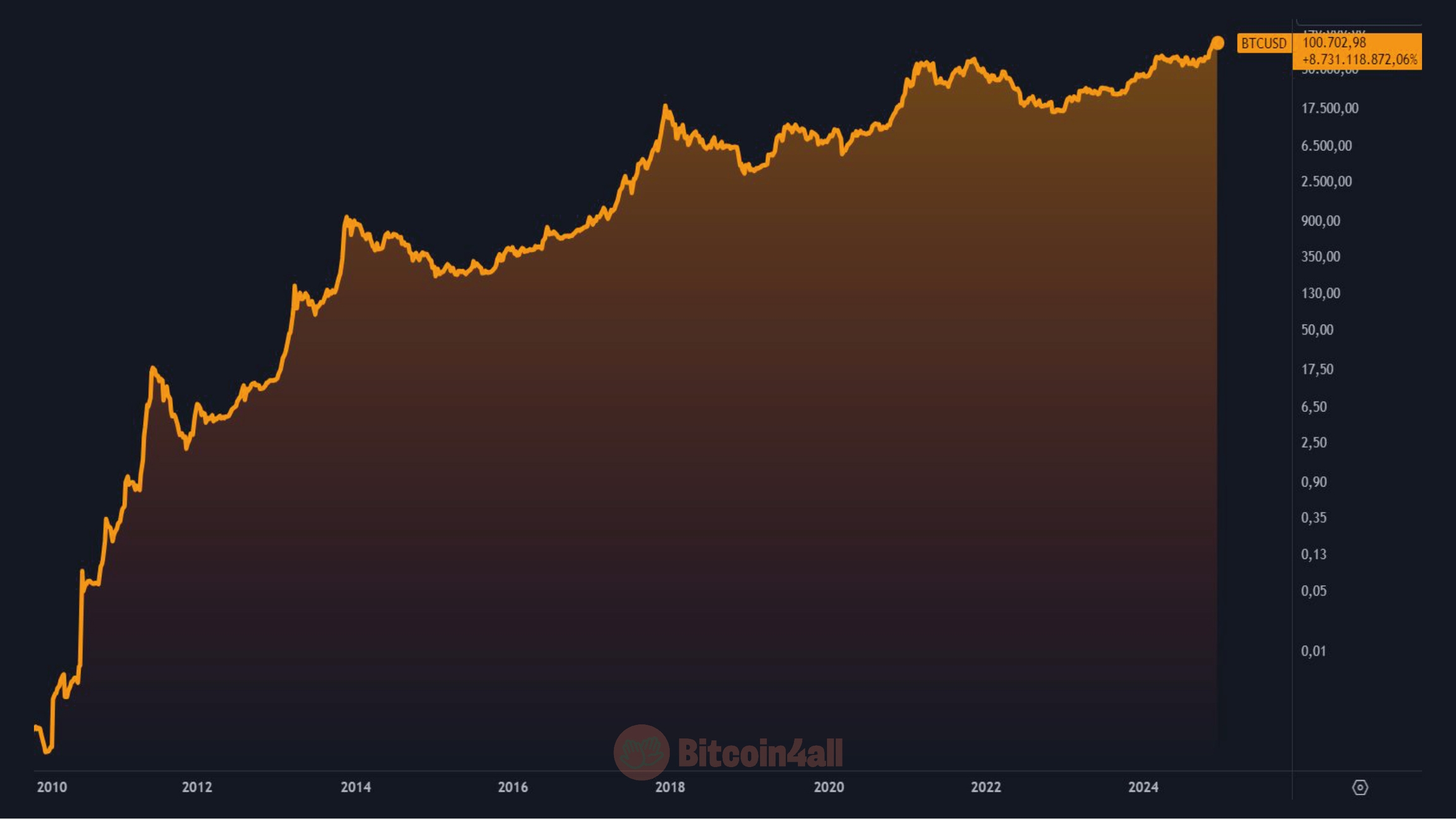 Desde su lanzamiento en 2009, Bitcoin se ha revalorizado de forma impresionante. Al principio, no tenía precio: su valor era literalmente cero. Sin embargo, a lo largo de los años, Bitcoin ha acumulado un crecimiento de más de 8.000 millones por ciento en dólares entre 2010 y 2024. En 2024, alcanzó la marca de los 100.000 dólares por unidad, consolidando su trayectoria de volatilidad a corto plazo, pero de crecimiento continuo a lo largo de 15 años.