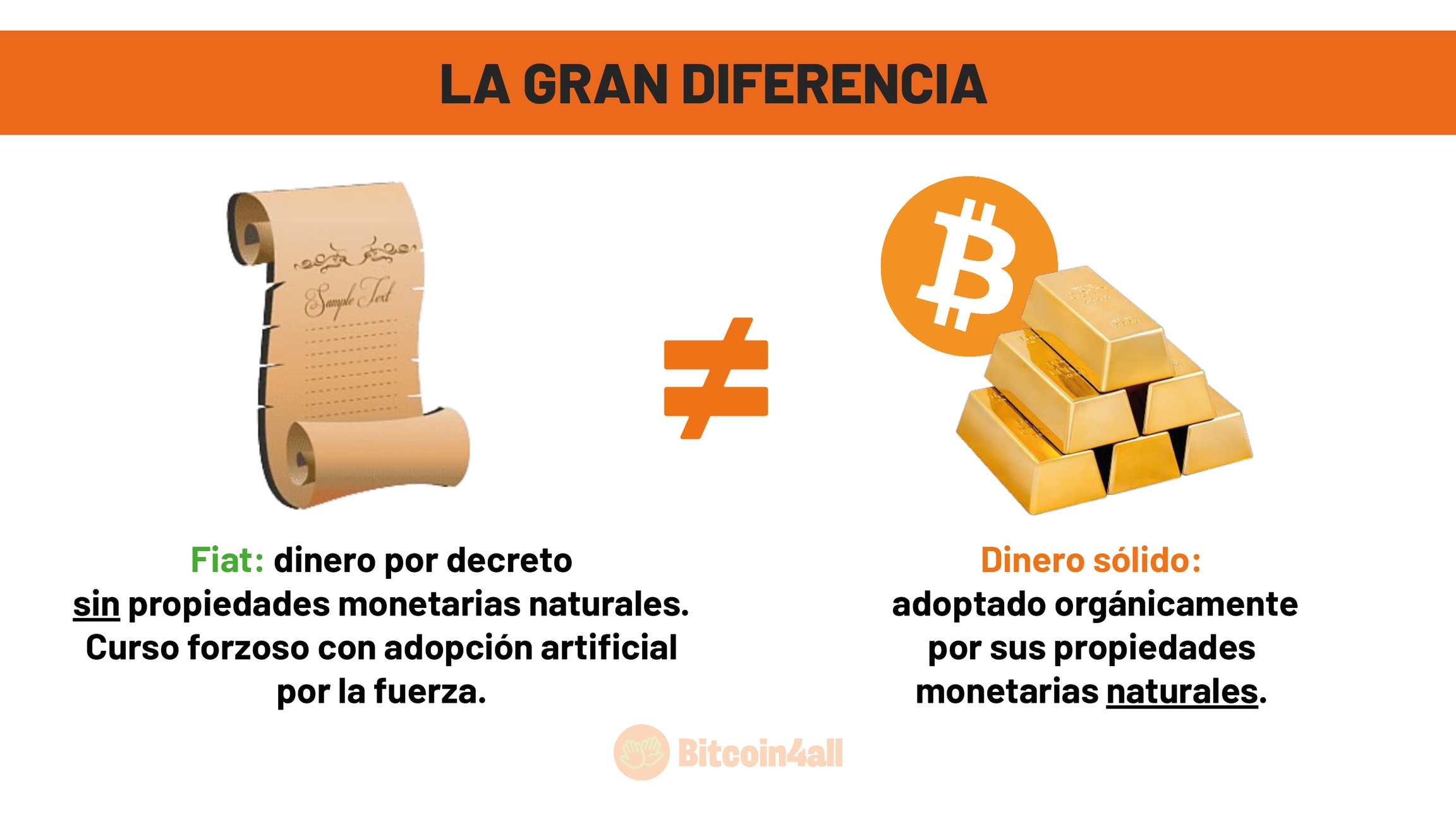 Bitcoin es fundamentalmente diferente de las monedas fiat. El término "fiat" viene del latín y significa "hágase". Es dinero por decreto, impuesto por los gobiernos mediante leyes de circulación forzosa, es decir, adoptado artificialmente y no por sus propiedades monetarias naturales. La gente utiliza monedas fiat porque se ve obligada a ello, mientras que el Bitcoin y el oro se adoptan libremente debido a sus propiedades naturales.