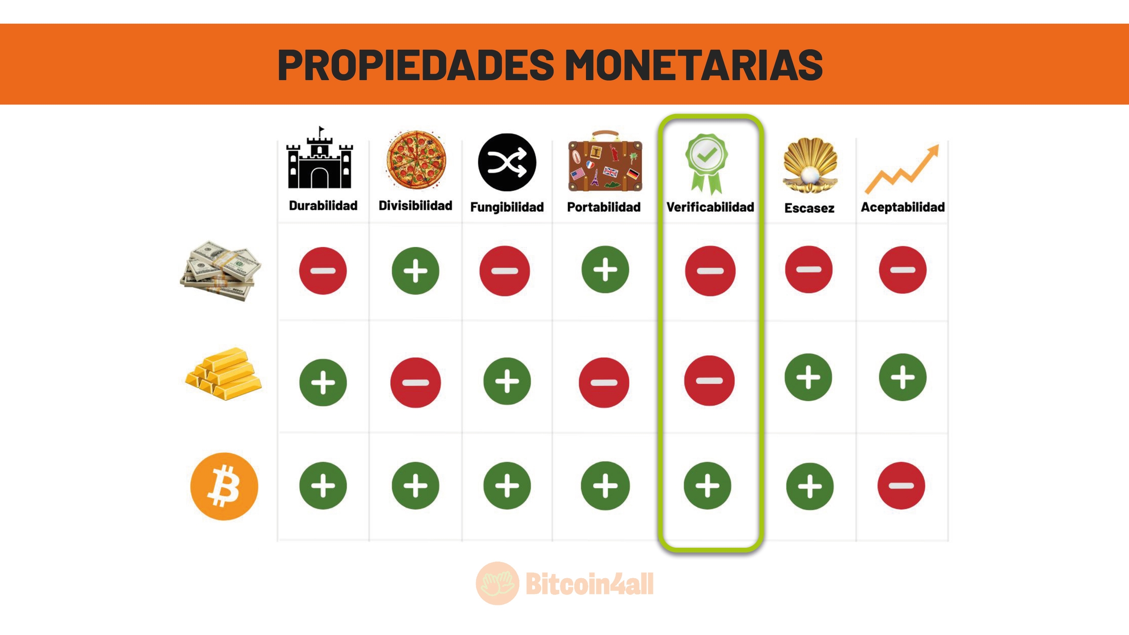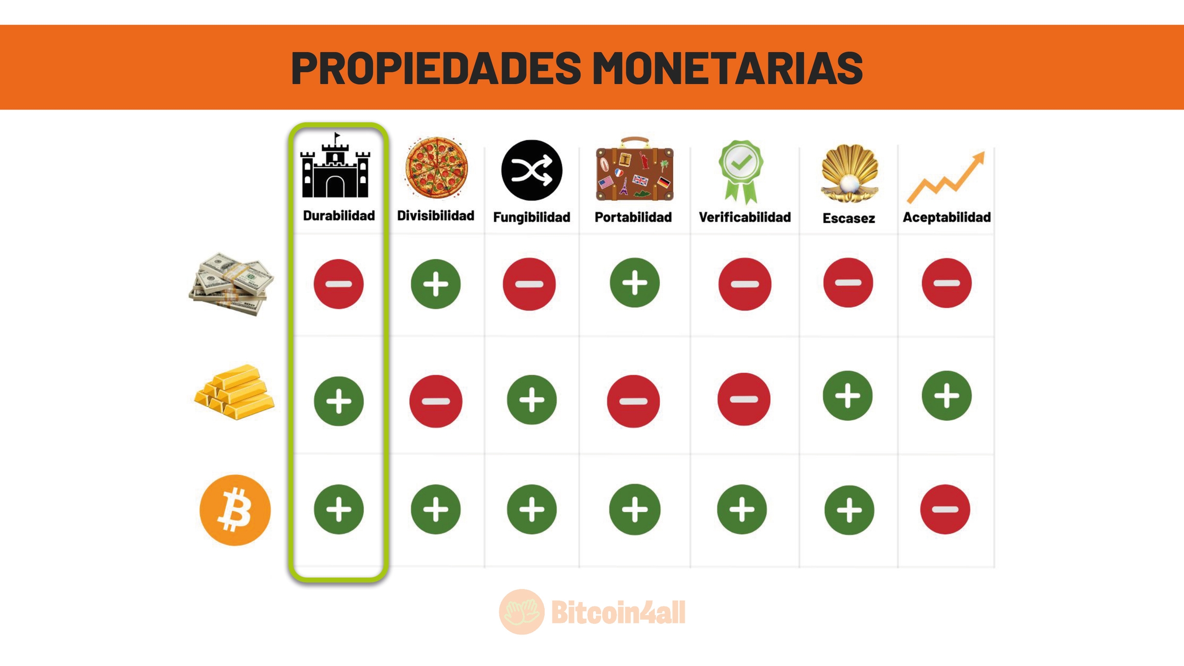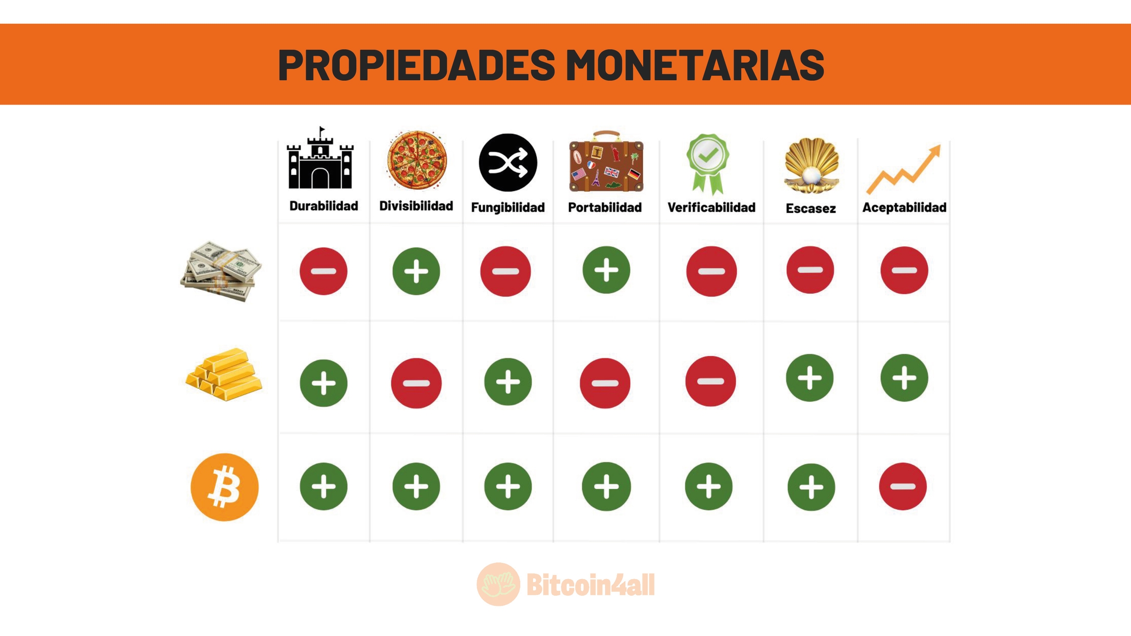 Esa imagen muestra las principales características que definen el buen dinero, es decir, el dinero con fuertes propiedades monetarias. Sus características son: