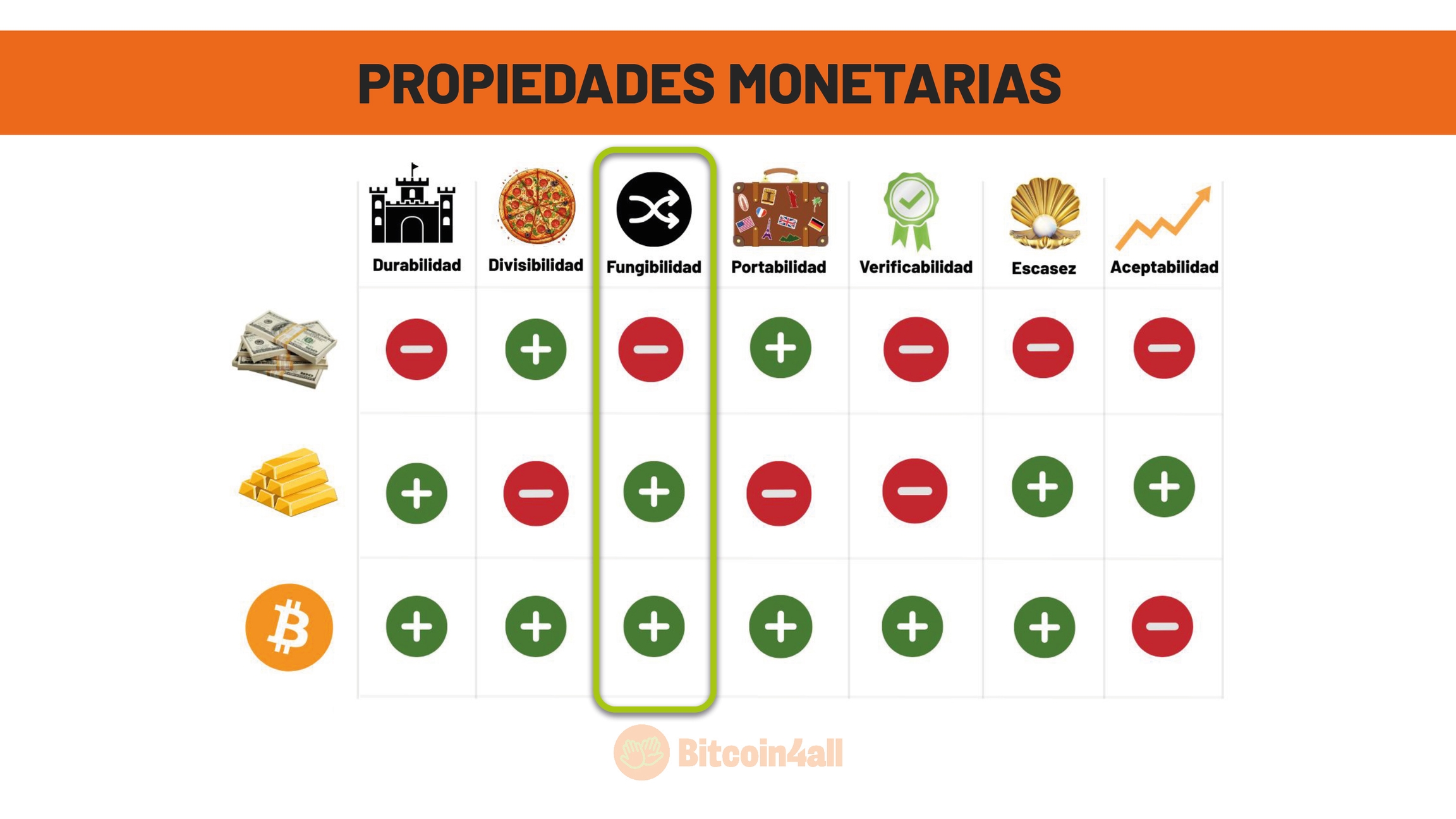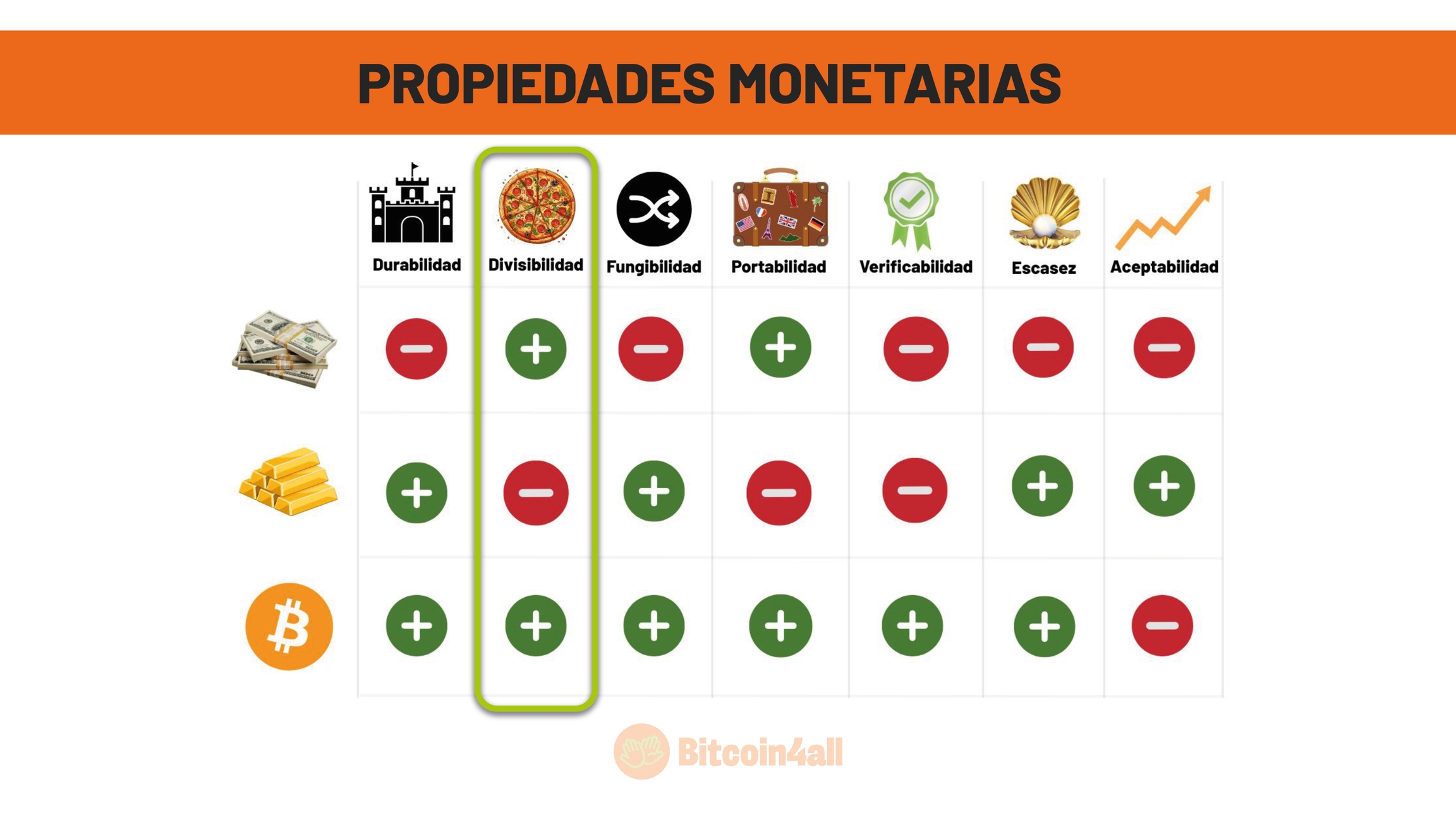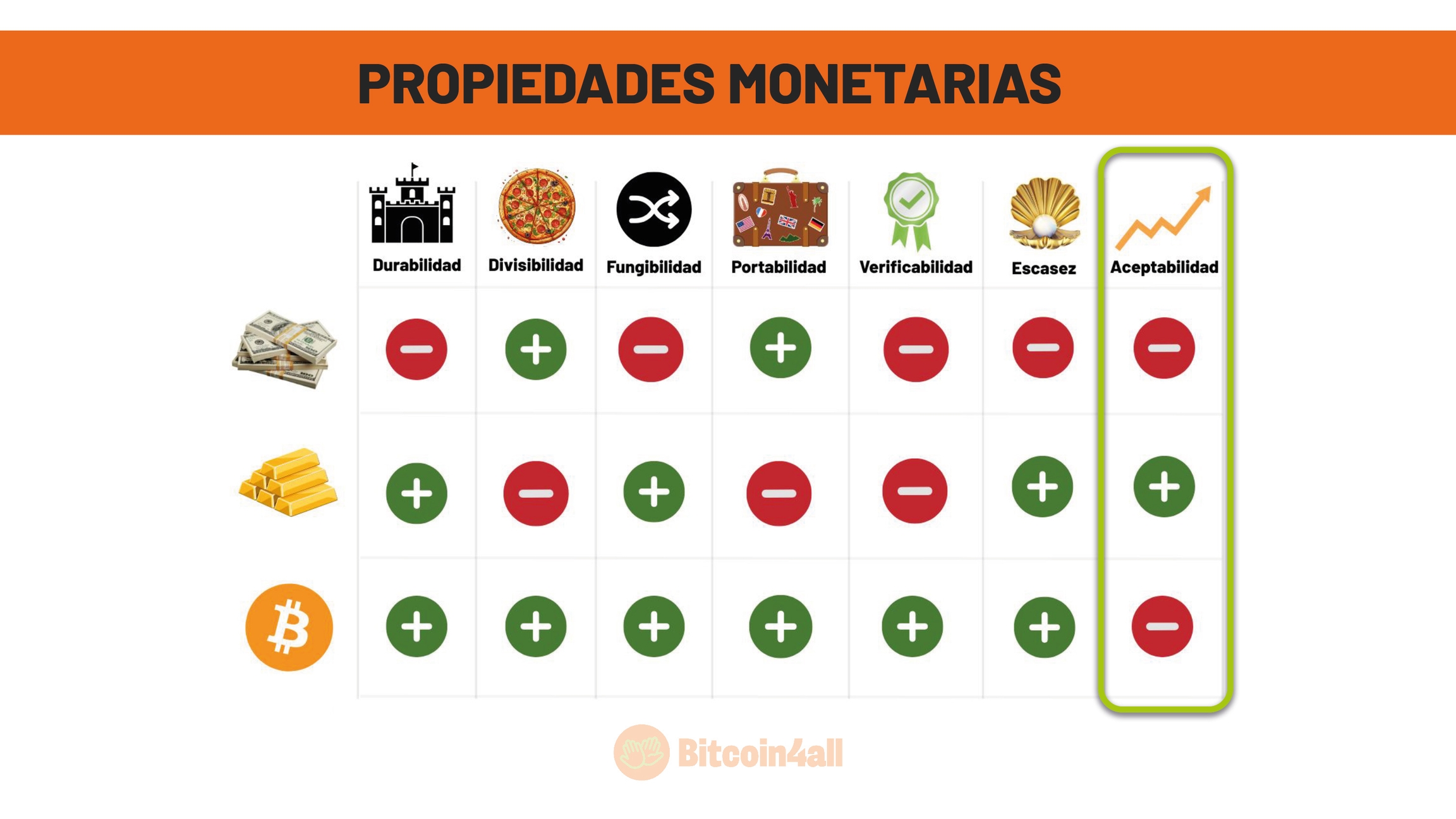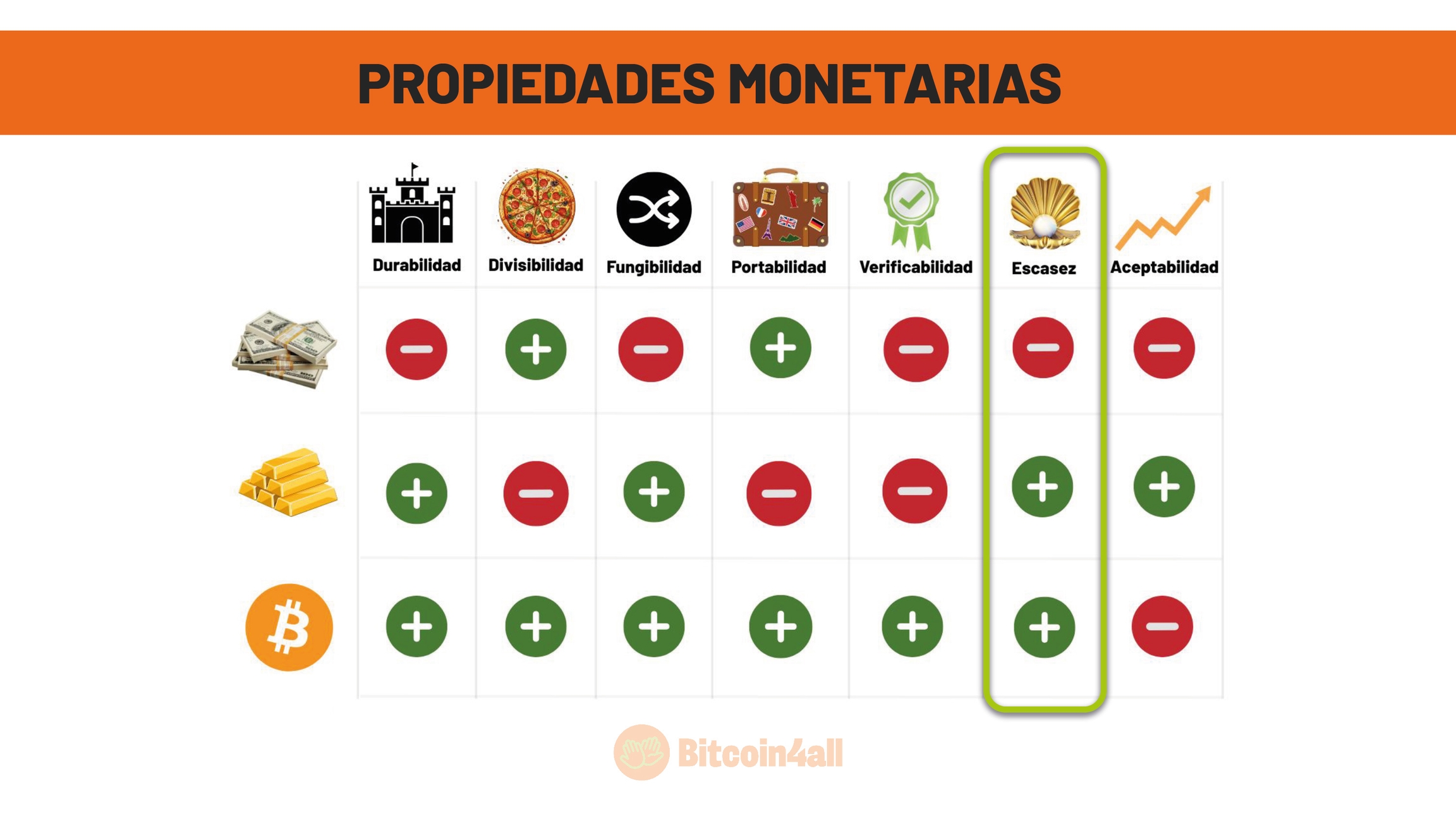 Esa imagen muestra las principales características que definen el buen dinero, es decir, el dinero con fuertes propiedades monetarias. Sus características son: