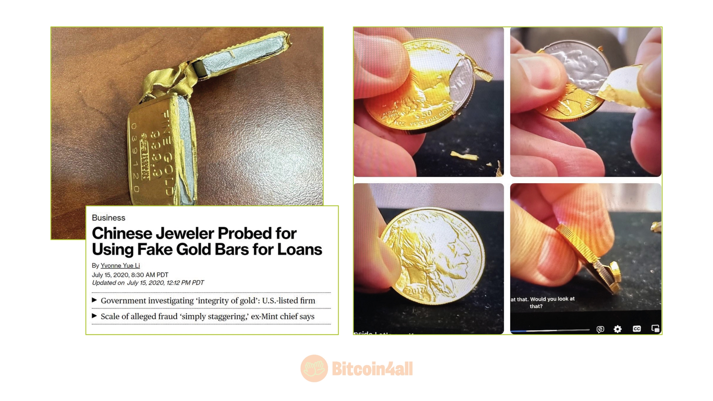 Incluso el oro puede falsificarse, lo que revela importantes limitaciones en su verificabilidad. Hay muchos ejemplos de fraude relacionados con el oro, como los lingotes de oro adulterados. Se han encontrado algunos lingotes almacenados incluso en las cajas fuertes de los bancos centrales con tungsteno en el núcleo y recubiertos sólo con una capa de oro puro. Las monedas chapadas en oro y las joyas fabricadas con aleaciones metálicas de baja calidad también son ejemplos de falsificación.
