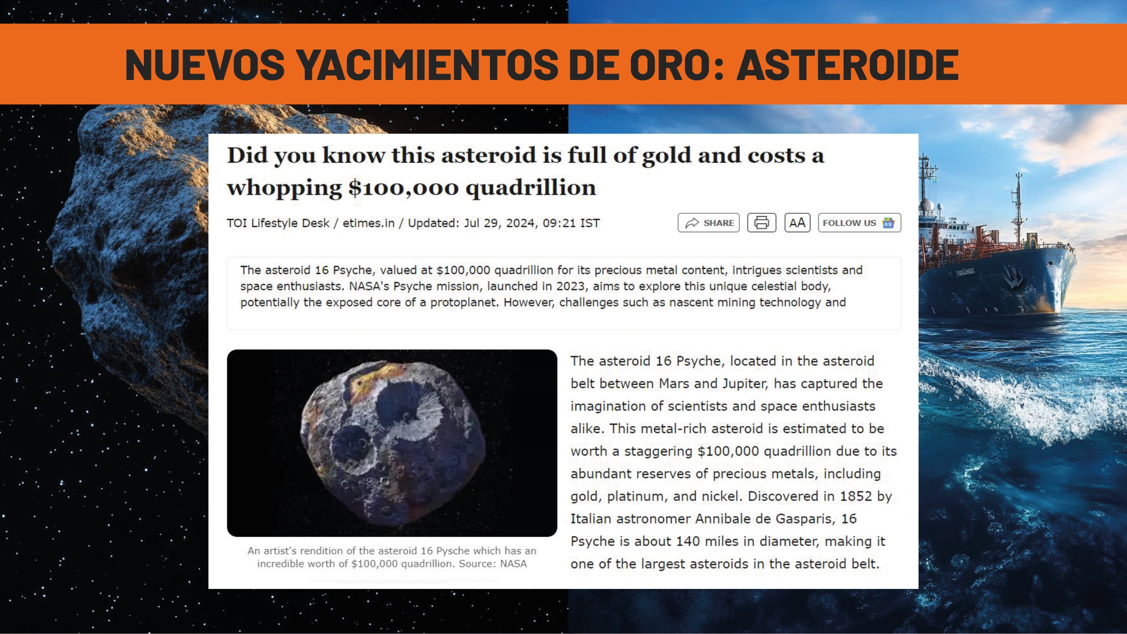 Informes como éste demuestran que hay asteroides llenos de metales preciosos, incluido el oro, con un valor estimado de 100.000 cuatrillones de dólares. Si la minería espacial llega a ser viable, podría eliminar por completo la escasez de oro, una de sus principales propiedades monetarias.