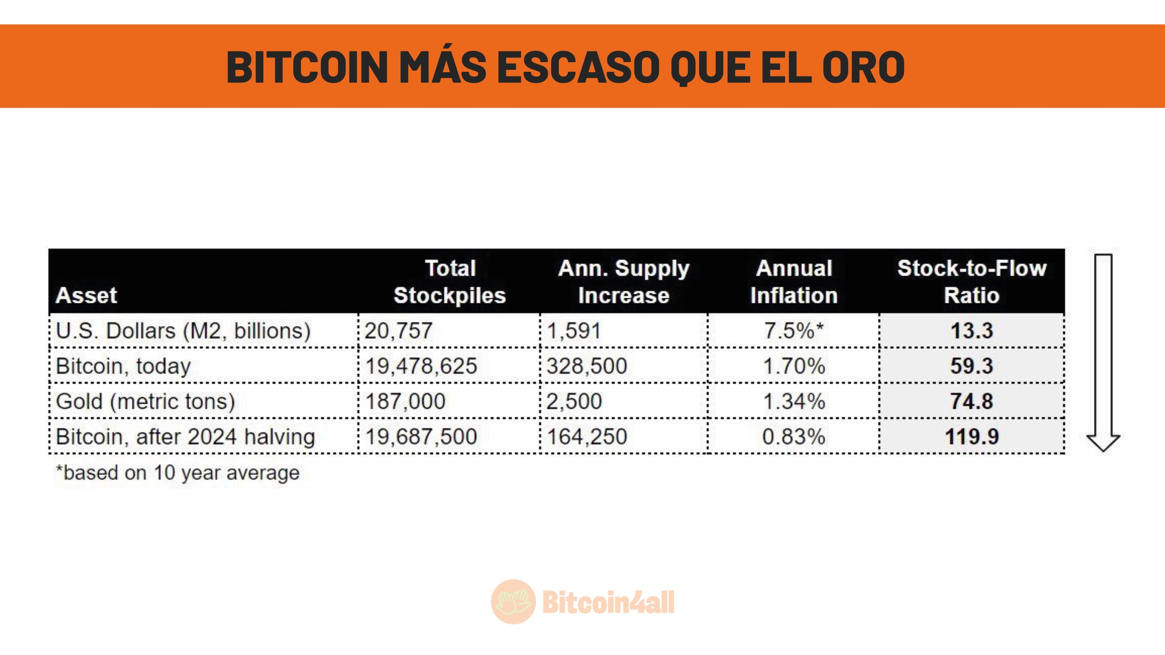 En 2024, Bitcoin será oficialmente más escaso que el oro, según la métrica stock-to-flow (S2F). Esa métrica se utiliza para medir la escasez de un bien, calculando la relación entre el stock total disponible (stock) y la cantidad producida anualmente (flow). Los activos con un S2F elevado, como el oro y el Bitcoin, tienen una oferta limitada, lo que los hace más valiosos porque es más difícil crear nuevas unidades de ellos.