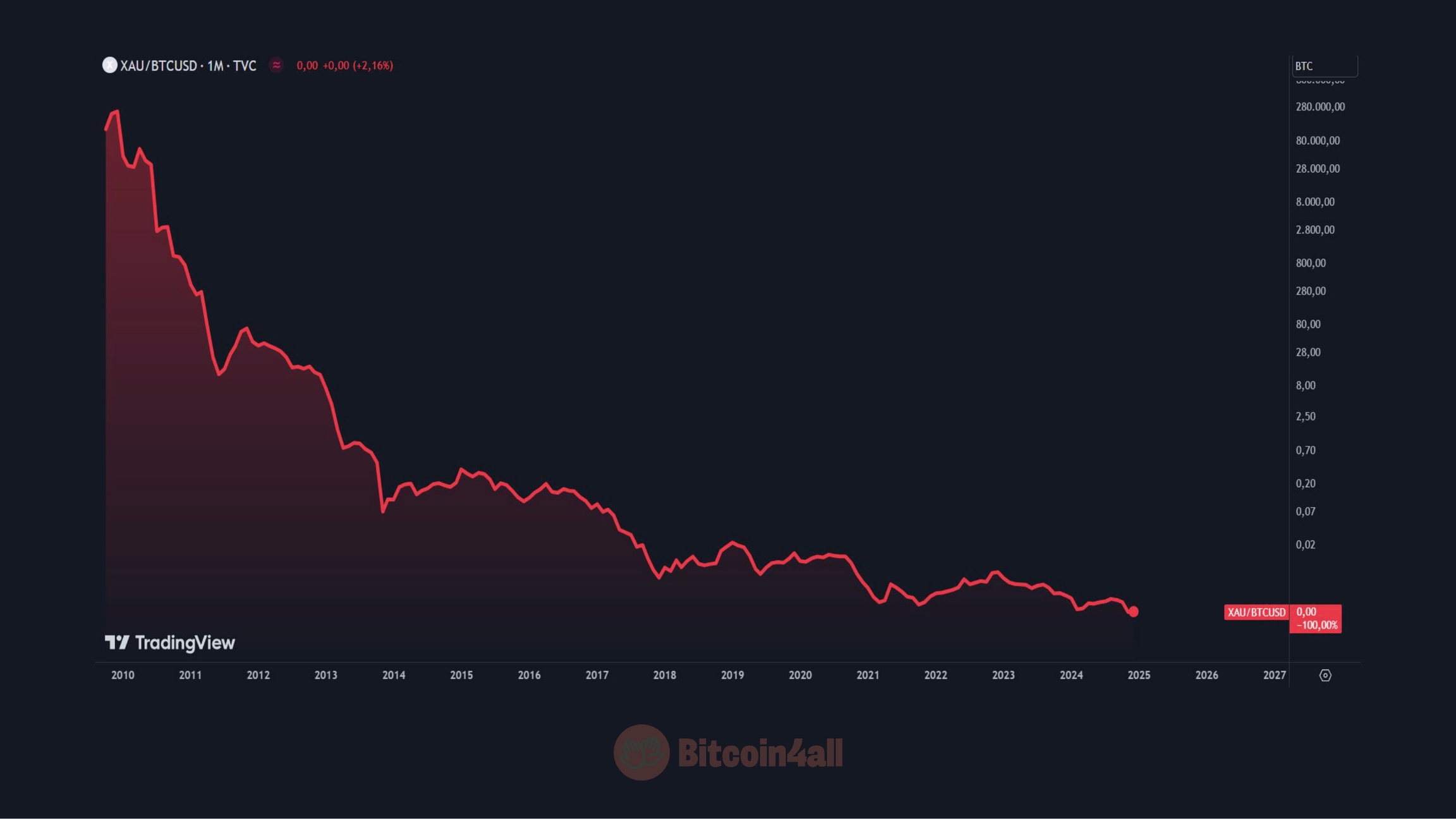 El propio oro está siendo desmonetizado gradualmente por el Bitcoin. Cotizado en bitcoins, el oro ha perdido casi el 100% de su valor. Eso nos muestra cómo el Bitcoin está sustituyendo al oro como el depósito de valor más antiguo del mundo.