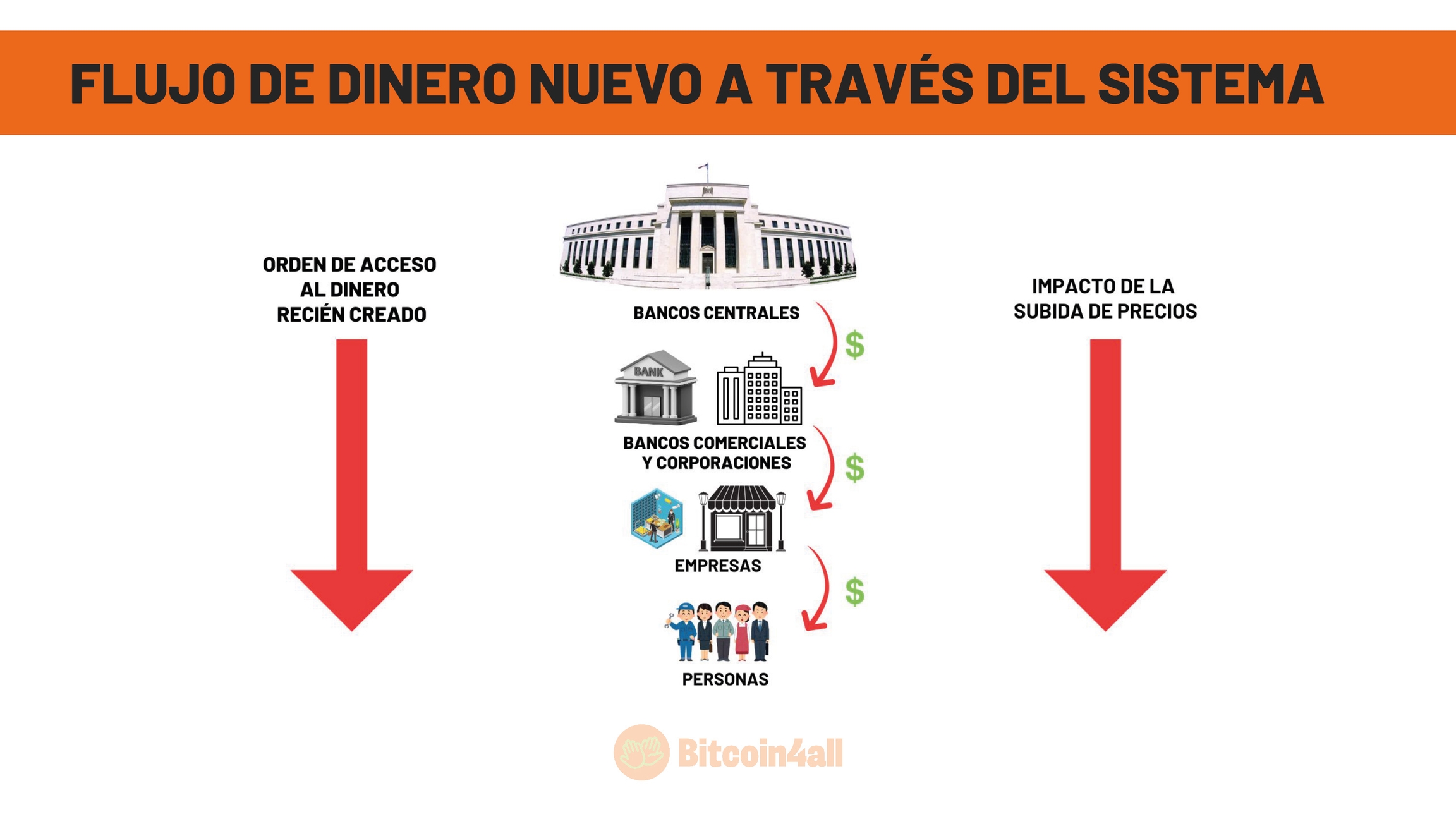 En el mundo moderno, el dinero sigue el mismo flujo que en tiempos de los reyes, pero con personajes actualizados. Ahora, los bancos centrales crean dinero y los primeros en recibirlo son los grandes bancos y empresas. Esos actores utilizan el dinero recién creado para invertir o recomprar sus propios activos, como acciones. El dinero se utiliza para pagar a ejecutivos, directores y otros altos cargos. Por último, llega a los empleados y clientes de la base económica.
