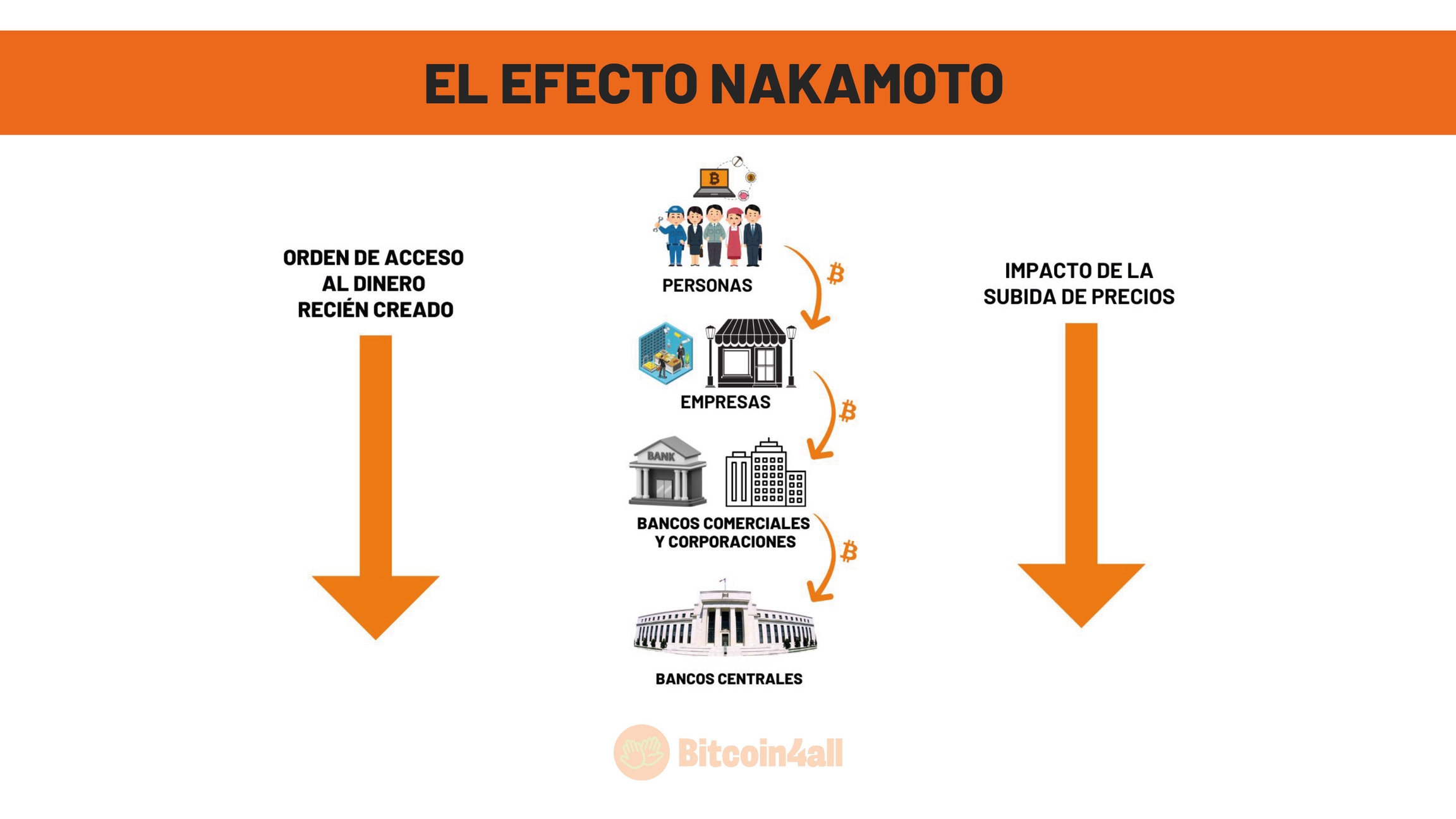 Bitcoin invierte el Efecto Cantillon porque no depende de imprentas controladas por gobiernos o bancos centrales. No hay forma de imprimir más Bitcoin y diluir la oferta circulante. Invirtiendo la lógica fiduciaria, acaba generando más valor para los más alejados de las imprentas: primero para la gente corriente, que empezó a acumular Bitcoin individualmente, luego para las empresas, más tarde para los bancos y corporaciones y, sólo recientemente, para los gobiernos, que están empezando a reconocer la importancia y por fin están "dando el visto bueno" a Bitcoin.