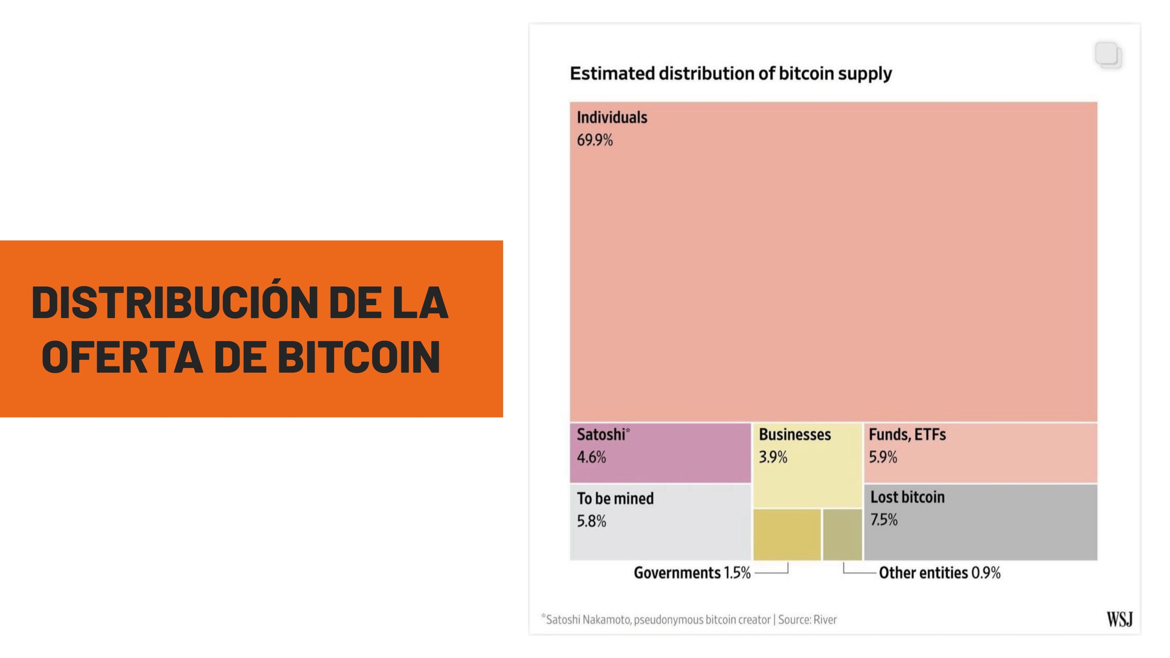 La historia de la distribución de Bitcoin refleja todo eso. Prácticamente el 70% de los bitcoins están en manos de particulares, lo que demuestra que la mayoría de la gente corriente son los principales poseedores; el 3,9% están en empresas y negocios que utilizan o invierten en Bitcoin; el 5,9% están en ETFs y fondos, lo que representa la entrada de las instituciones en el ecosistema; el 1,5% pertenecen a gobiernos, que sólo ahora están empezando a reconocer Bitcoin; el 7,5% se pierden debido a que la gente no cuida bien sus claves privadas; el 4,6% están en direcciones que pertenecen a Satoshi Nakamoto, que nunca ha movido ni vendido sus saldos, manteniendo estas monedas fuera de circulación y el 5,8% quedan por minar y se distribuirán gradualmente hasta el año 2140.