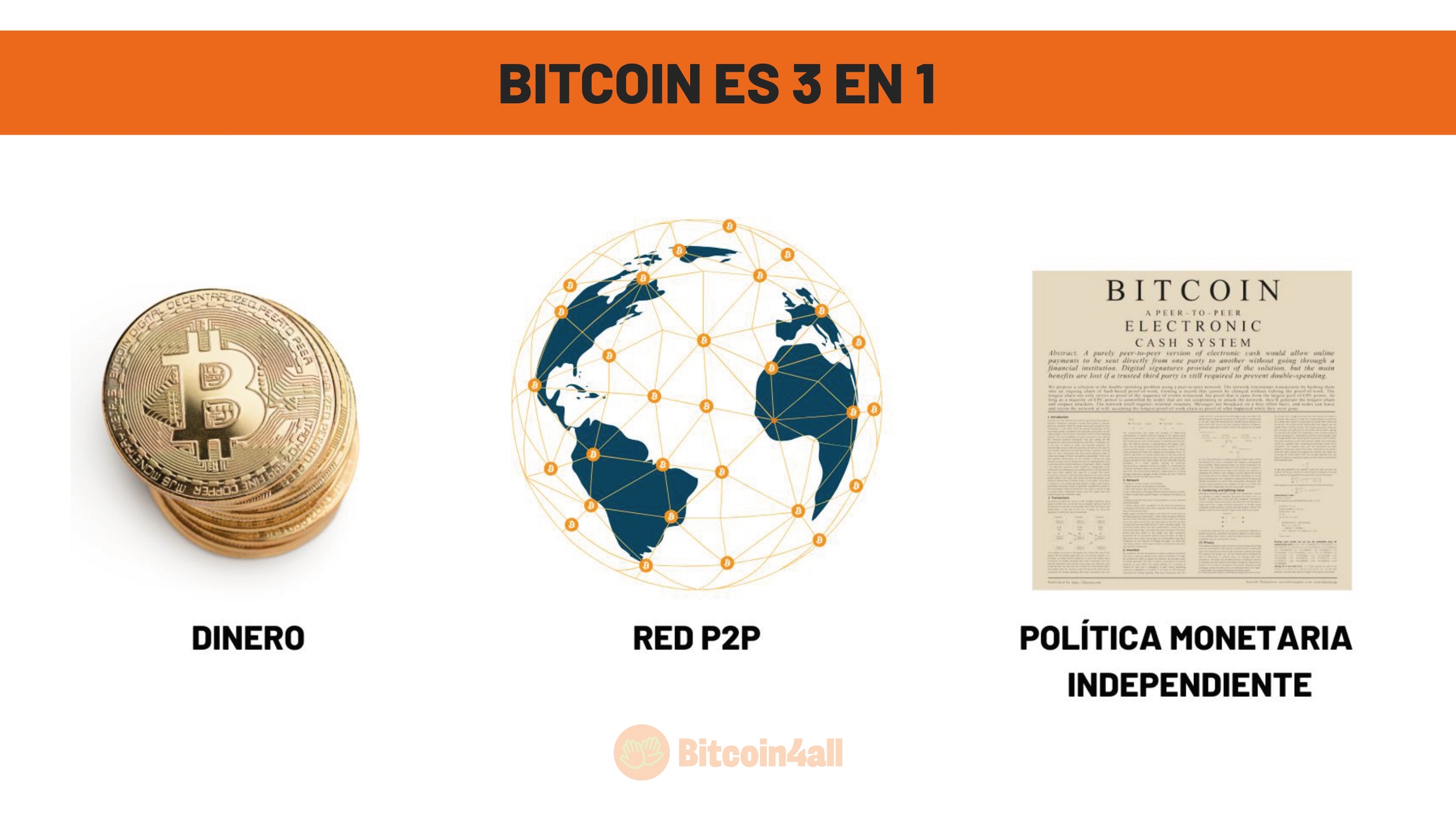 Bitcoin es dinero que no pierde valor: al contrario, gana, trayendo más prosperidad a todos. Bitcoin dispone de una red monetaria sin depender de ningún banco: sin sucursales, sin gestor, sin solicitar ningún dato personal. Sólo tienes que descargarte un monedero y podrás recibir bitcoins desde cualquier lugar del planeta sin ninguna barrera. Y Bitcoin es mejor que cualquier banco central porque proporciona más previsibilidad, transparencia y garantías de conservación de la riqueza y la propiedad que cualquier banco central. Por eso Bitcoin no sólo es mejor dinero, sino un sistema monetario mejor y más justo a nivel mundial. Beneficia a todos los países, no sólo a los que tienen la moneda de reserva en vigor.