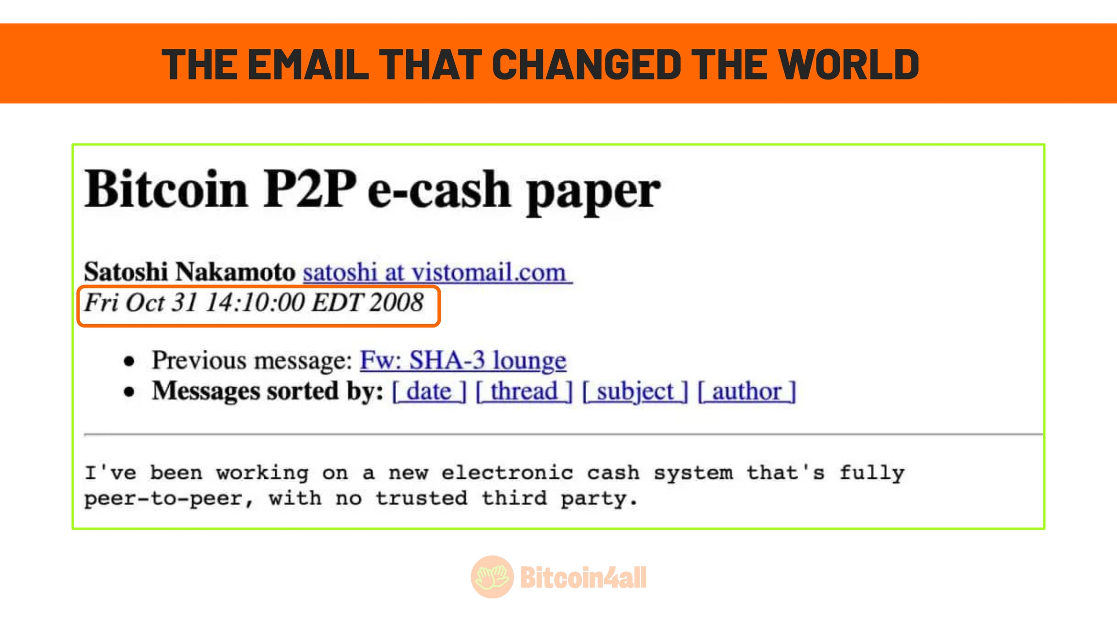 The first records of Bitcoin begin with an email on October 31, 2008. On that day, an anonymous cypherpunk named Satoshi Nakamoto posted on a cryptography mailing list that he was working on a paper about an peer-to-peer (P2P) electronic cash system, without the need for trusted intermediaries.