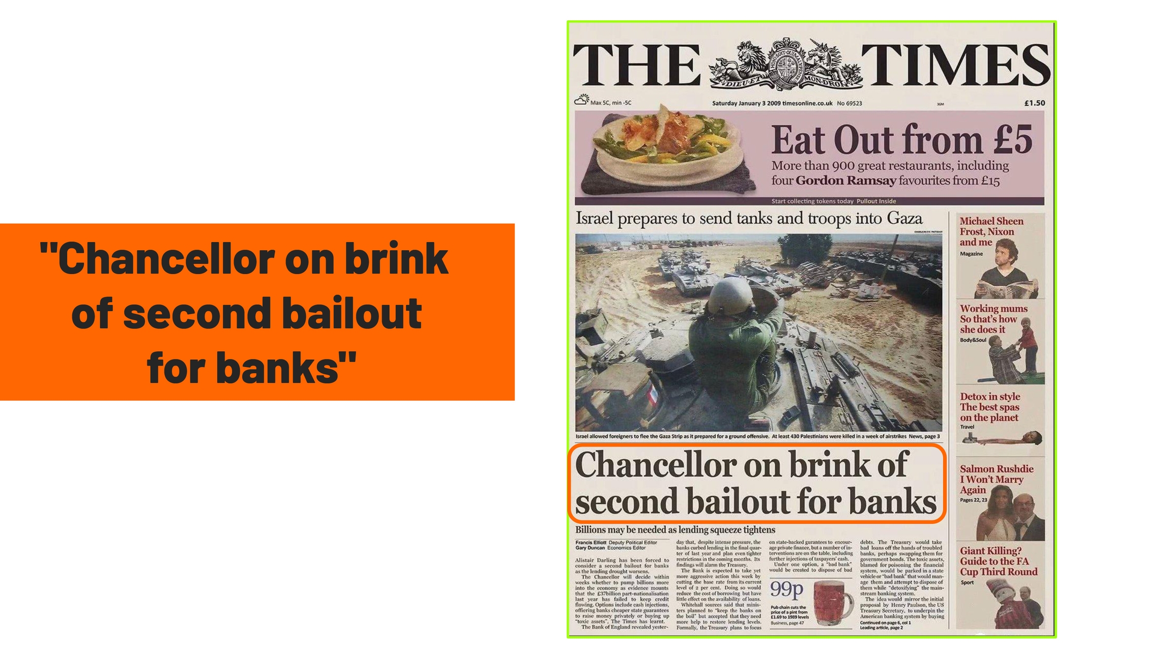 "The Times 03/Jan/2009 Chancellor on brink of second bailout for banks" - this is the title on the cover of the British newspaper The Times from January 3, 2009. This cover here: