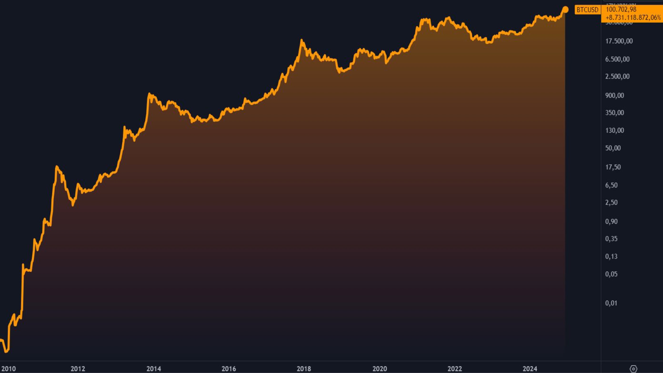 Since then, Bitcoin, which was initially worth nothing, has reached new highs with each appreciation cycle. It reached $100,000 at the time I am recording this class and has appreciated more than 7 billion percent in dollars since 2010, when it began to be traded and priced by the first online platforms.