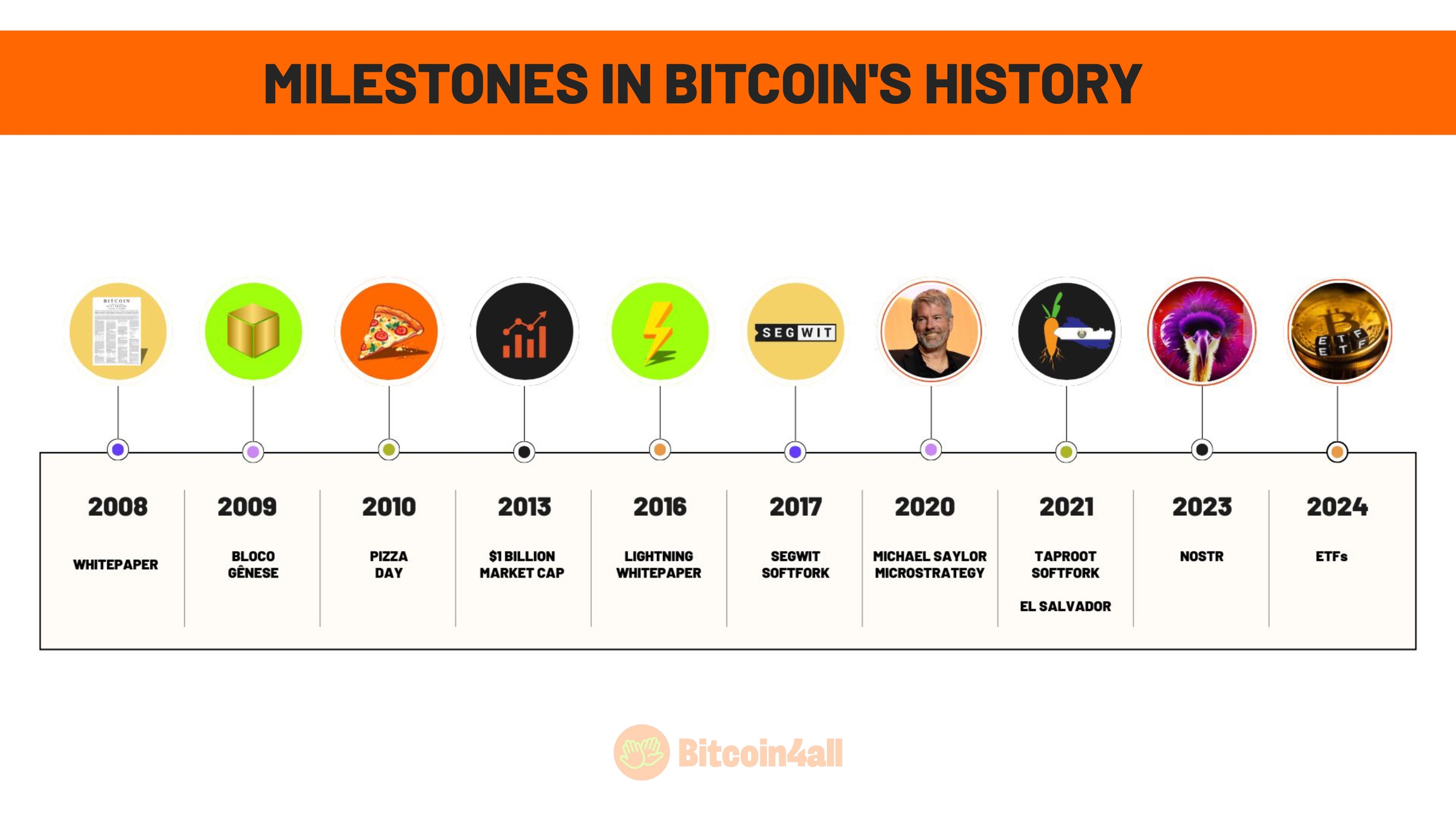 Well, you already know the first two milestones: in 2008 the whitepaper was released and in 2009 the bitcoin network started running.