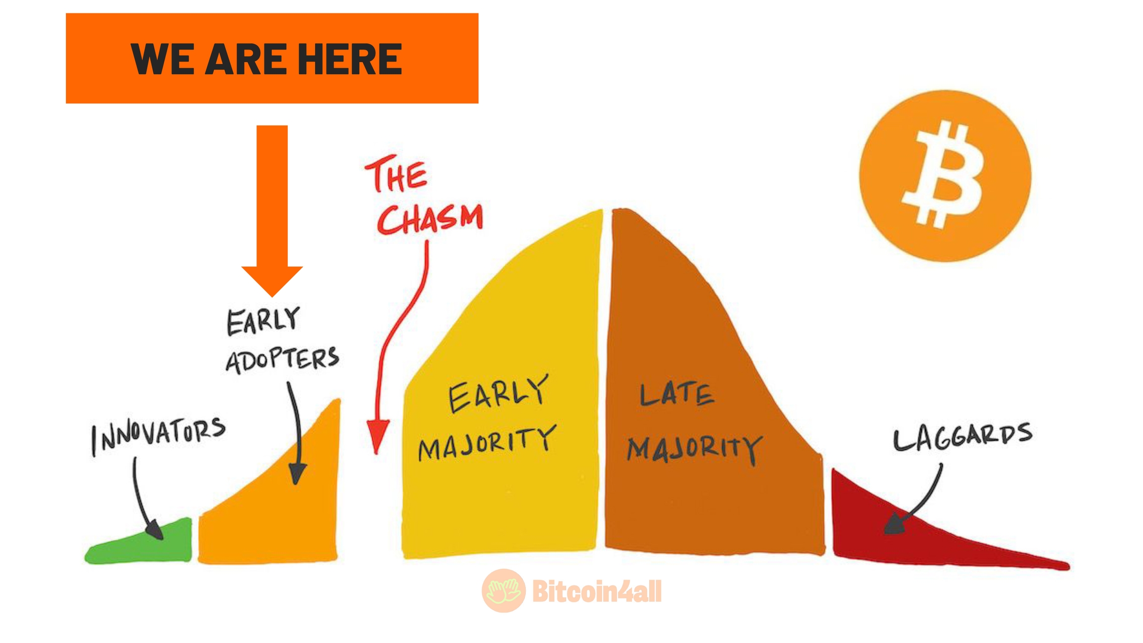 In the case of Bitcoin, the chasm represents the transition between those who adopt Bitcoin out of ideology, curiosity or specific interests (such as innovators and enthusiasts) and the large mass of users who will only adopt the technology when it is perceived as safe, useful and easy to use. Bitcoin is at this critical point, at the beginning of the process of crossing the chasm.