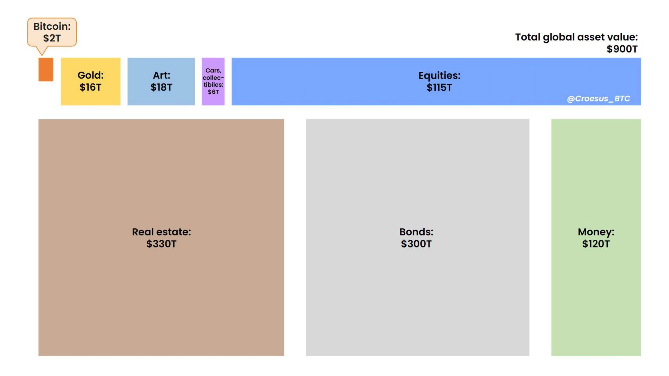 Here in this image we see how Bitcoin only has two trillion dollars in market capitalization, while other asset classes, such as real estate, stocks and gold, have tens or hundreds of trillions of dollars.