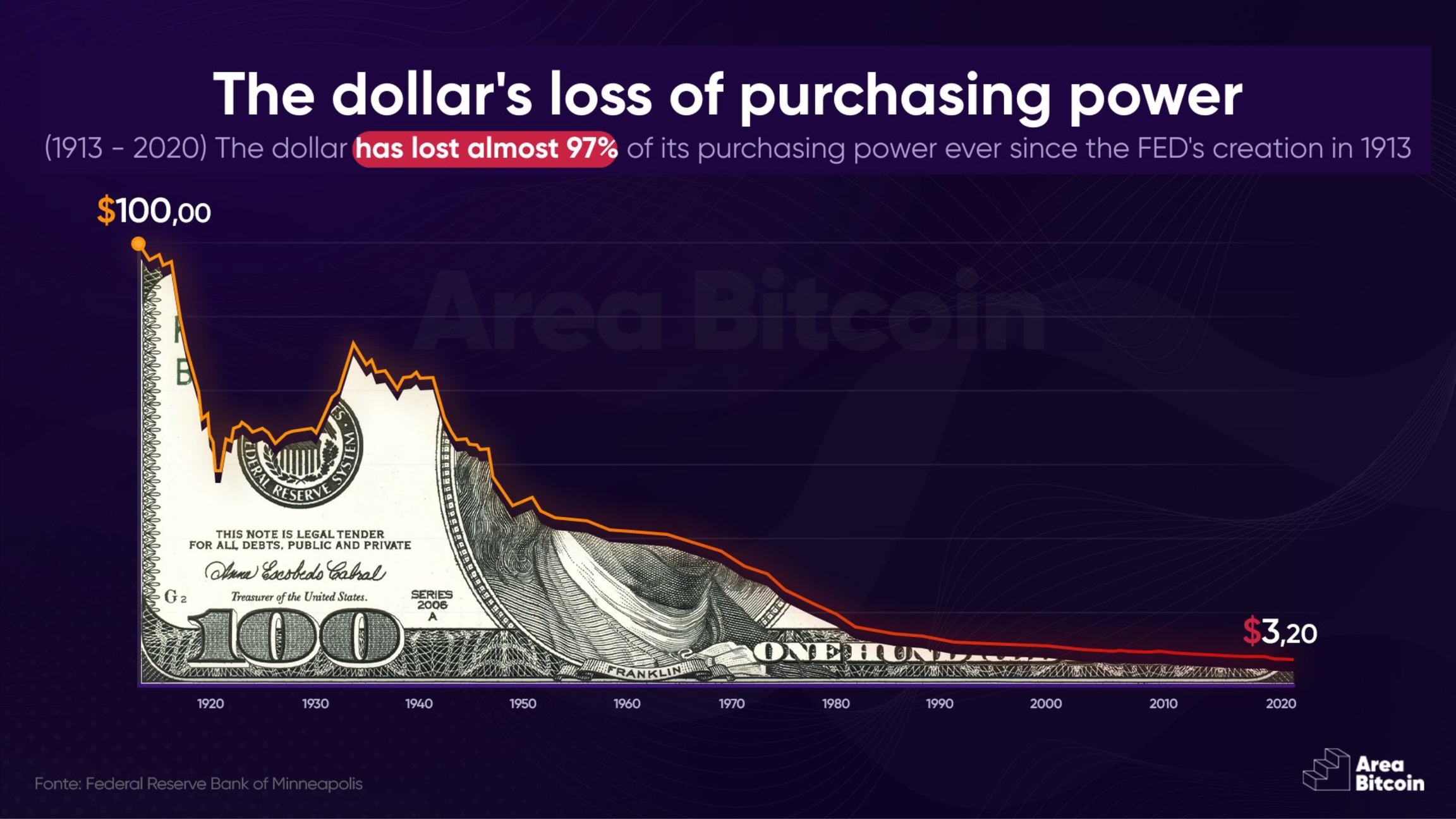 The dollar has lost 97% of its value since the Federal Reserve, the central bank of the United States, was created in 1913. The purchasing power of 100 dollars today is equivalent to 3 dollars 120 years ago. This means that today you need to have 100 dollars to buy the same things you could buy with 3 dollars when the US currency was created. Impressive, right?